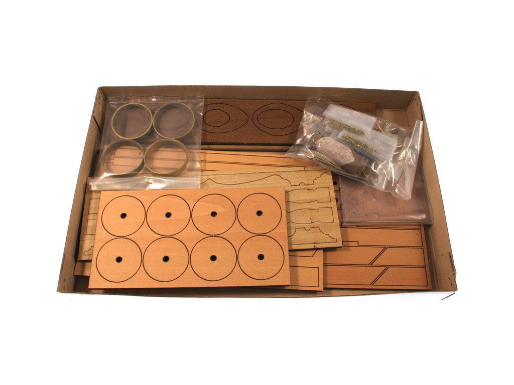 Po otevření víka krabice naleznete dřevěné díly modelu z překližky, lišty, drobné součásti v plastových sáčcích a manuál.