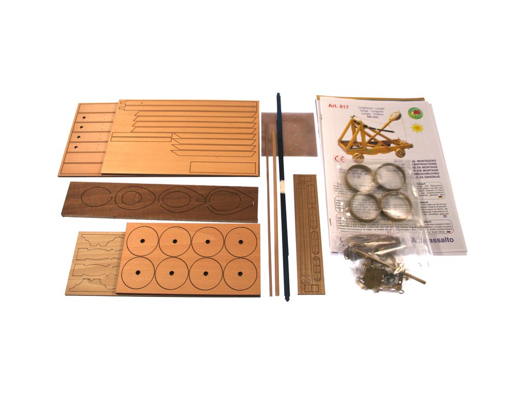 Stavebnice modelu Římského katapultu v měřítku 1:12. Konstrukce se skládá z předem nařezaných dřevěných dílů a kovových litých ozdob. Předloha katapultu pochází z 1. století našeho letopočtu. Originál katapultu je umístěn v muzeu v Římě.