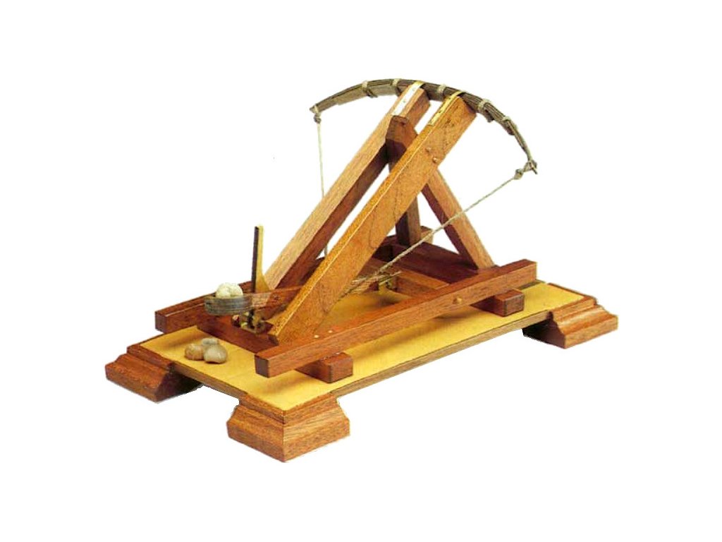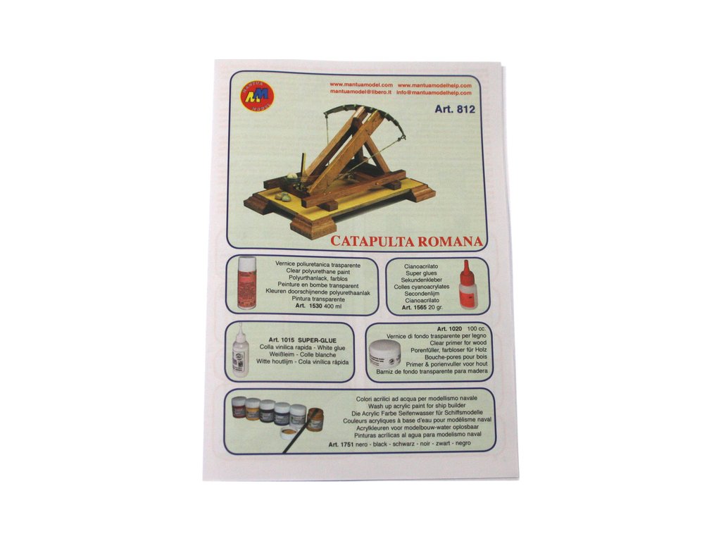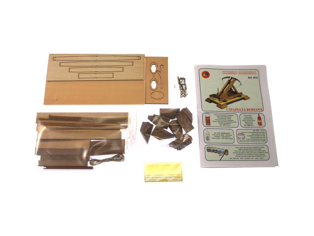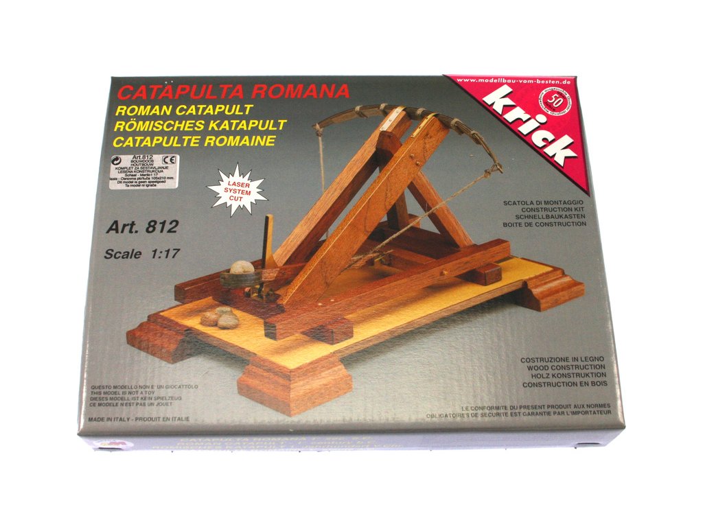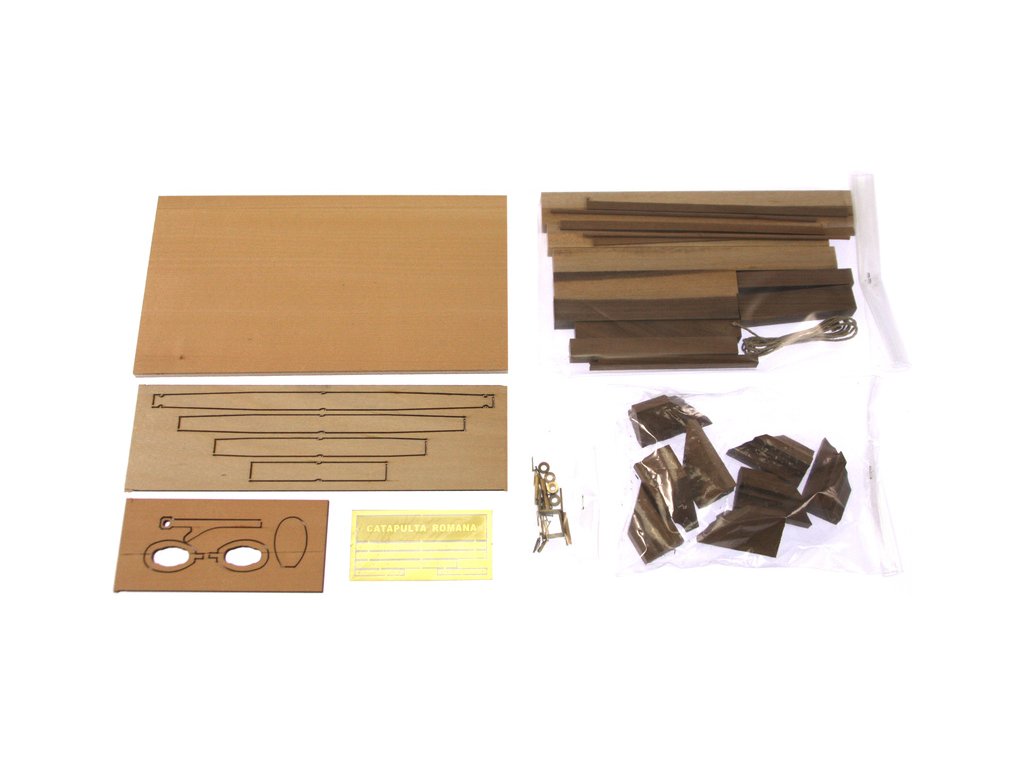 Stavebnice modelu Římského katapultu v měřítku 1:17. Zbraň z 1. století byla nejjednodušší těžká vrhací zbraň založená na principu luku. Sloužila jak k dobývání měst a pevností, tak k jejich obraně. Házela kameny a kamenné koule. Konstrukce se skládá z předem nařezaných dřevěných dílů a kovových litých ozdob.