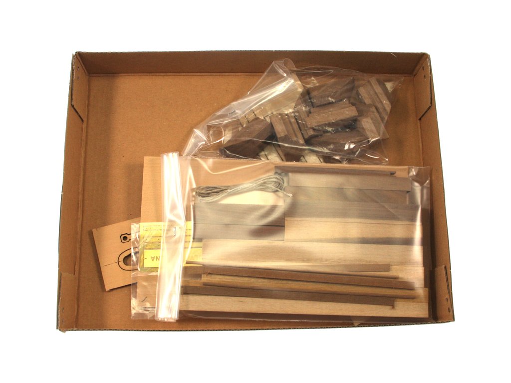 Po otevření víka krabice naleznete dřevěné díly modelu z překližky, lišty, drobné součásti v plastových sáčcích a manuál.