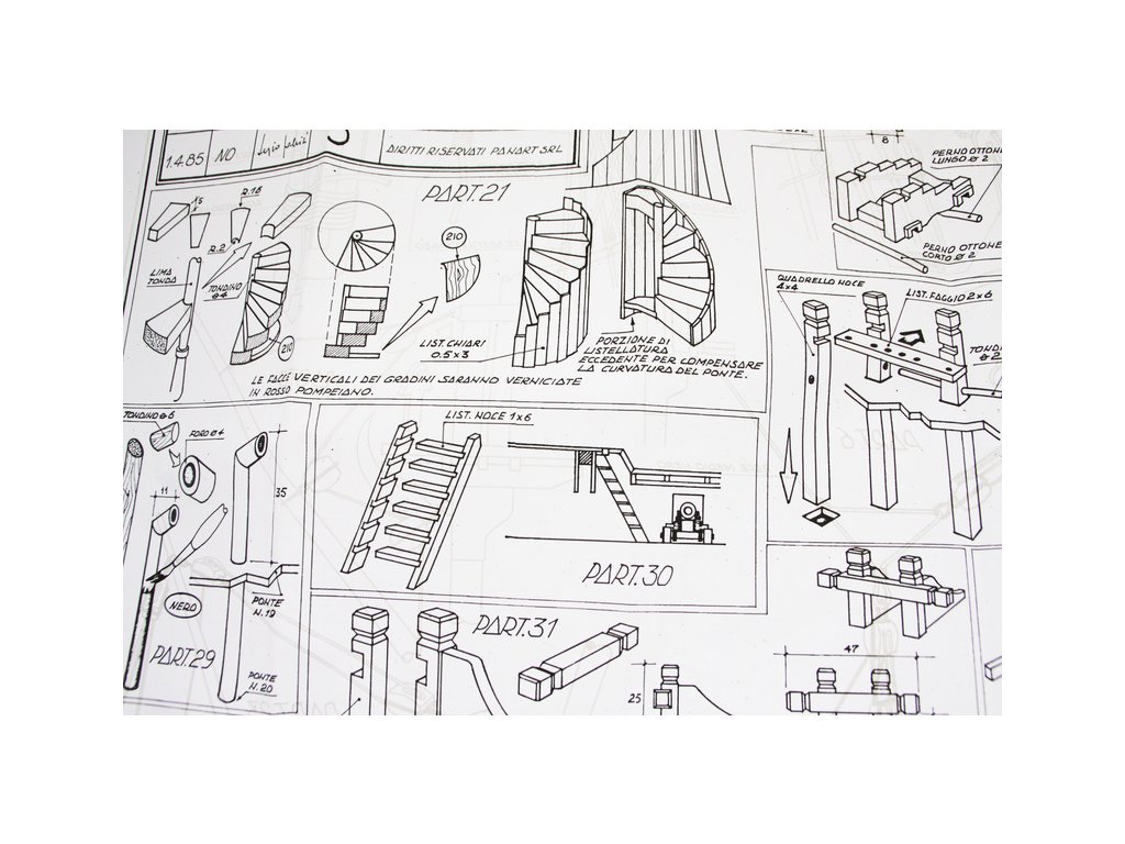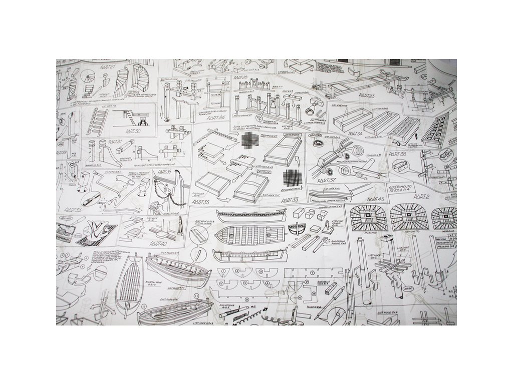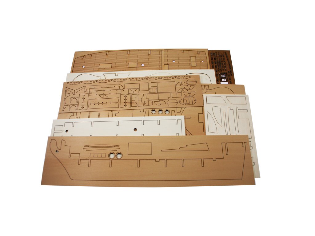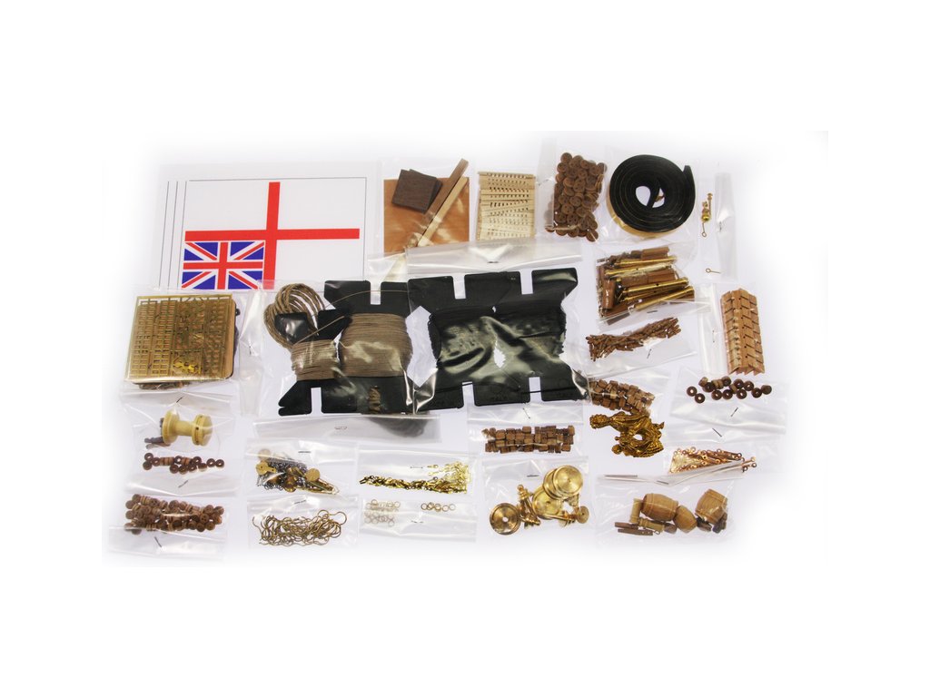 Balení obsahuje laserem řezané dřevěné díly, plaňky, paluby, stožáry, lanoví, kovové a dřevěné kování, kovové odlitky a dekorace vyleptané z mosazi. Stavební plány, vícejazyčný návod.