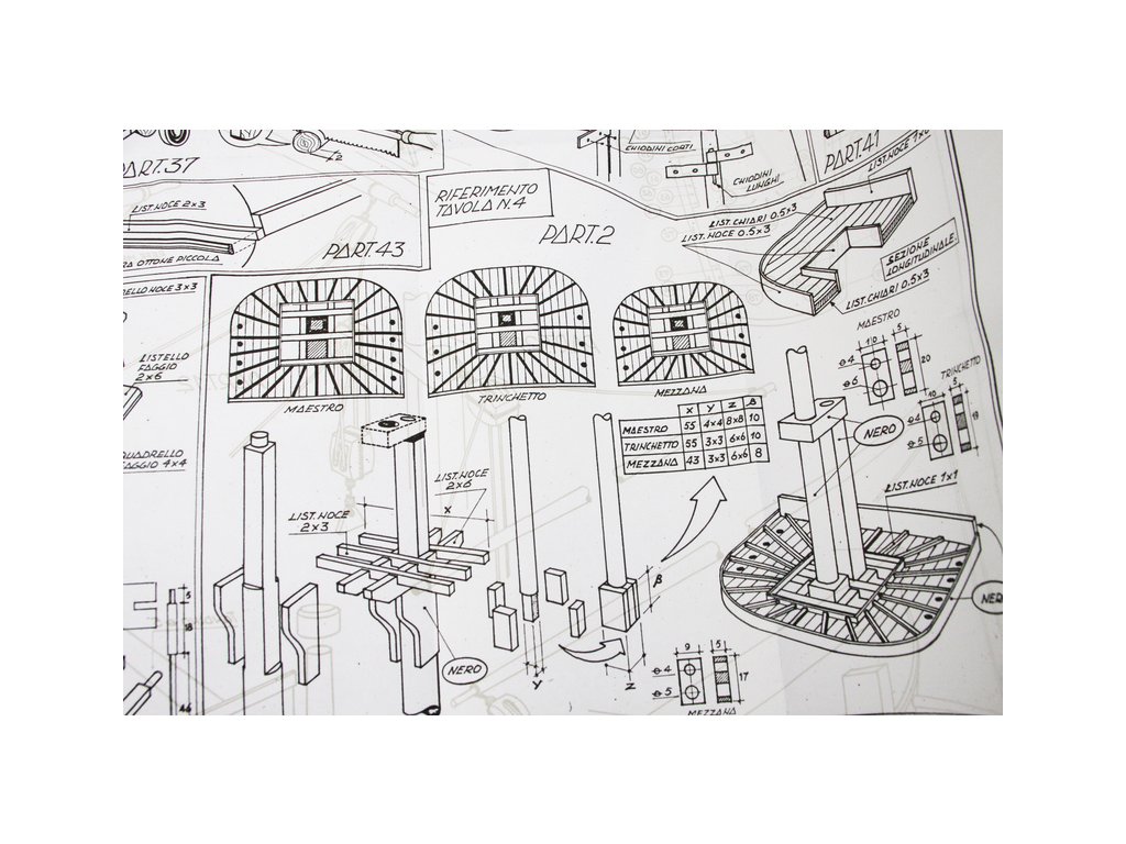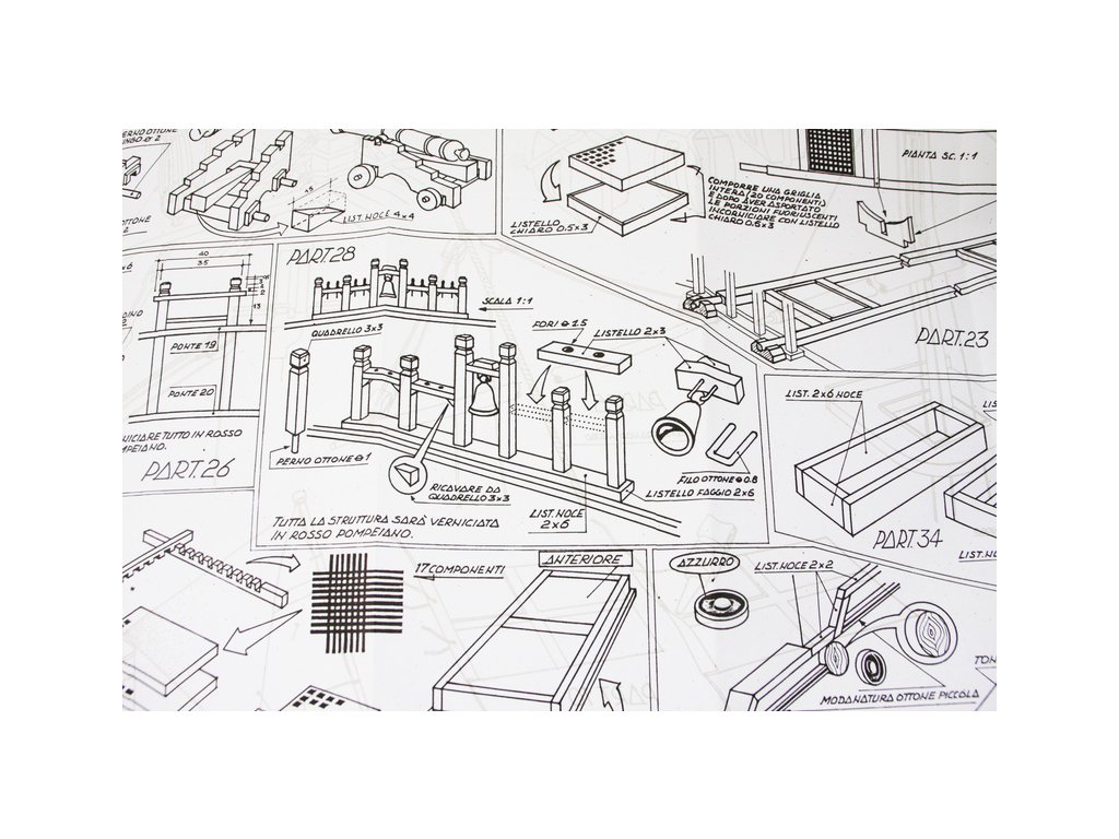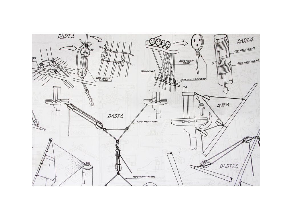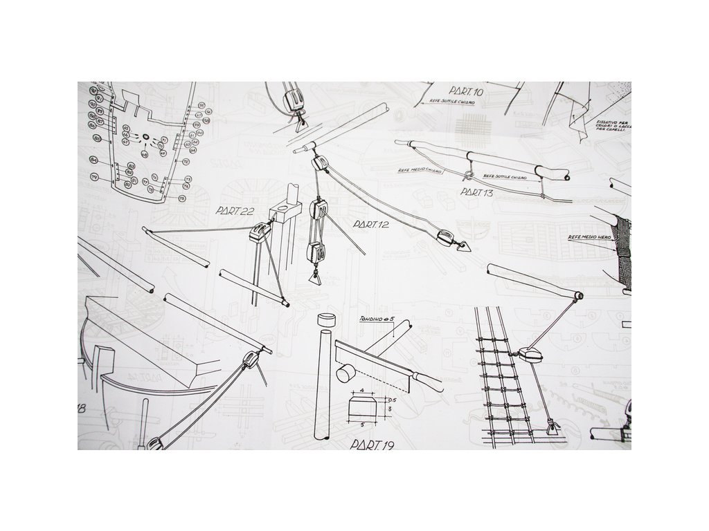 Balení obsahuje laserem řezané dřevěné díly, plaňky, paluby, stožáry, lanoví, kovové a dřevěné kování, kovové odlitky a dekorace vyleptané z mosazi. Stavební plány, vícejazyčný návod.