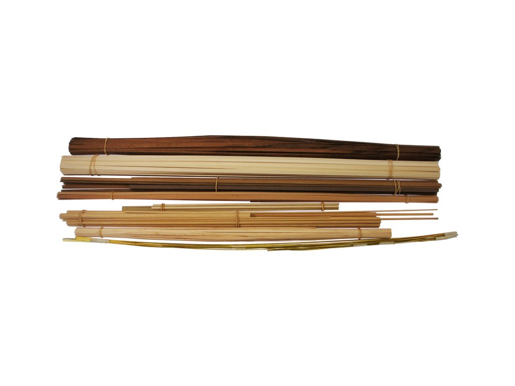 Po otevření víka krabice naleznete dřevěné díly modelu z překližky, lišty, drobné součásti v plastových sáčcích a manuál.