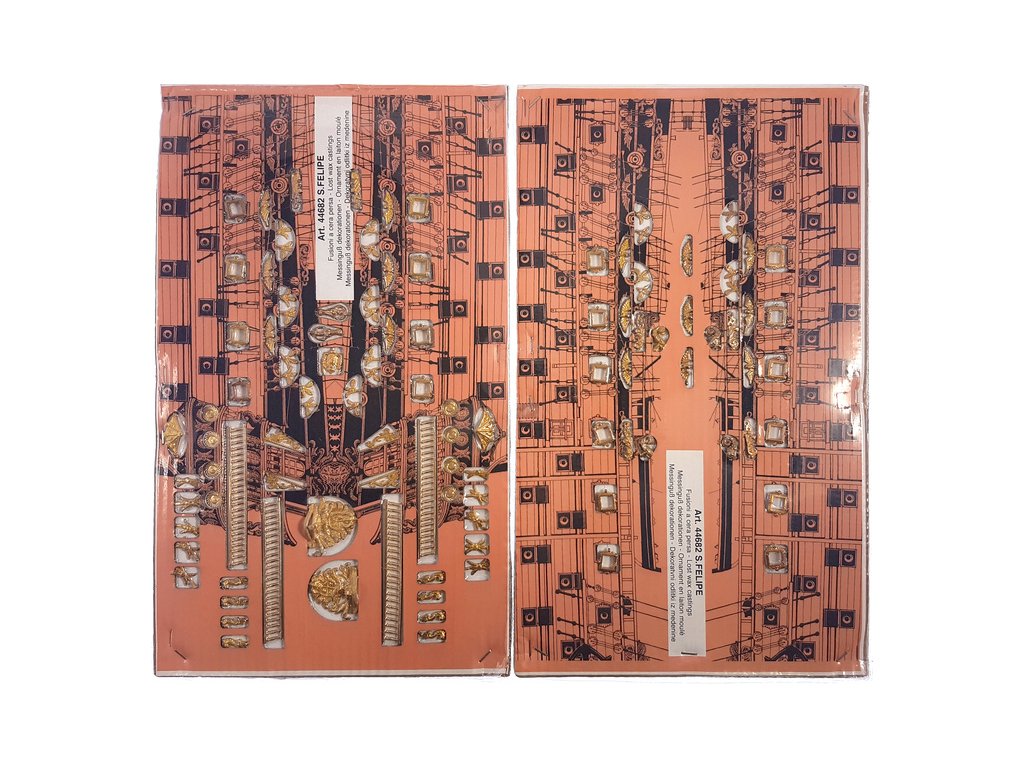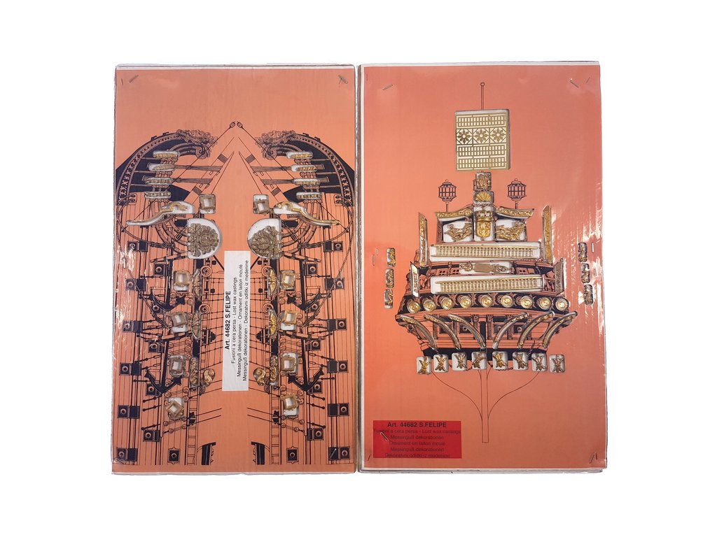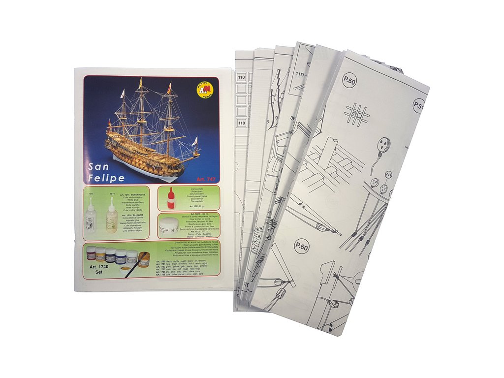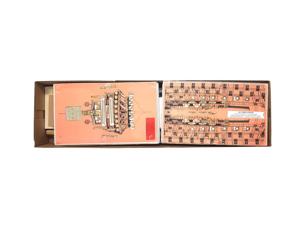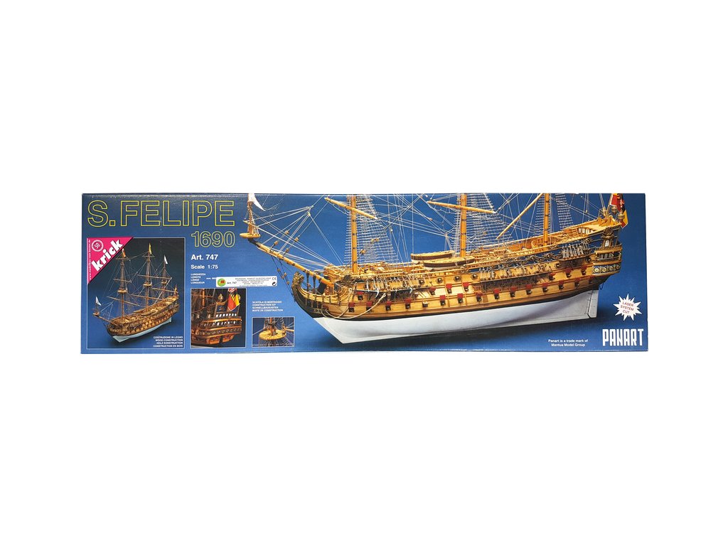 Stavebnice neplovoucího modelu španělské galeony San Felipe z roku 1690 v měřítku 1:75. Byla jednou z nejkrásnějších španělských galeon 18. století. Byla vedoucí lodí slavné španělské Armady. Kit obsahuje velké množství ozdobných dílů z mosazi, dřevěné díly, dvojité plaňkování a detailní návod s plány.