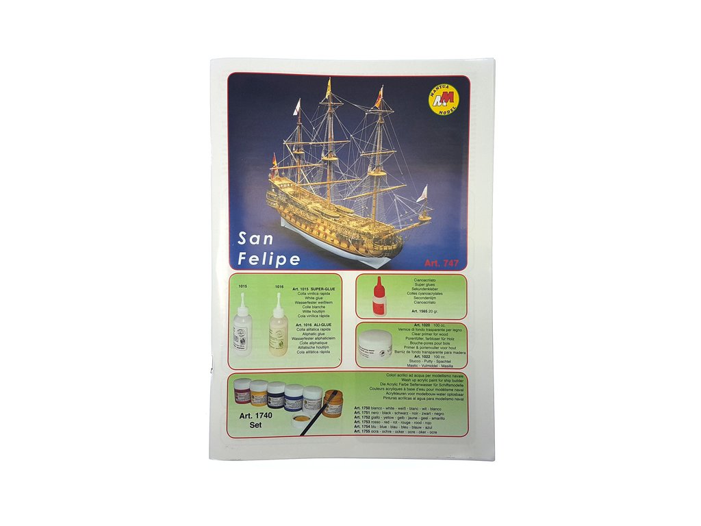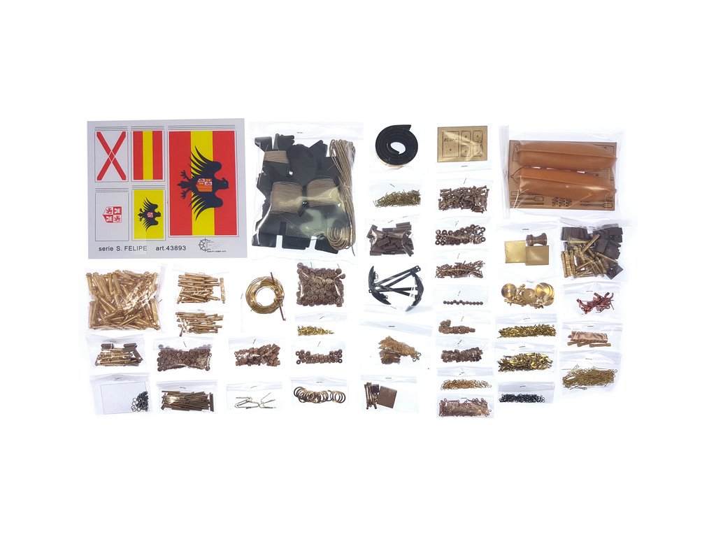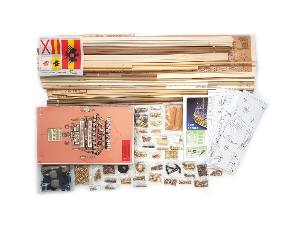 Stavebnice neplovoucího modelu španělské galeony San Felipe v měřítku 1:75. Byla jednou z nejkrásnějších španělských galeon 18. století. Byla vedoucí lodí slavné španělské Armady. Kit obsahuje velké množství ozdobných dílů z mosazi, dřevěné díly, dvojité plaňkování a detailní obrázkový návod s plány. Devízou této stavebnice je velké množství přesně odlitých kovových dílů z mosazi.