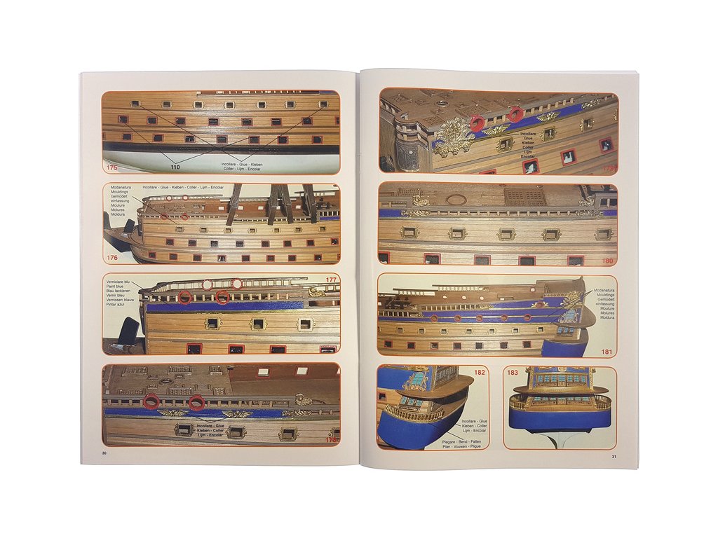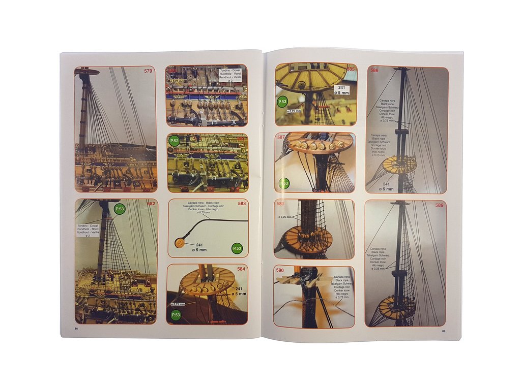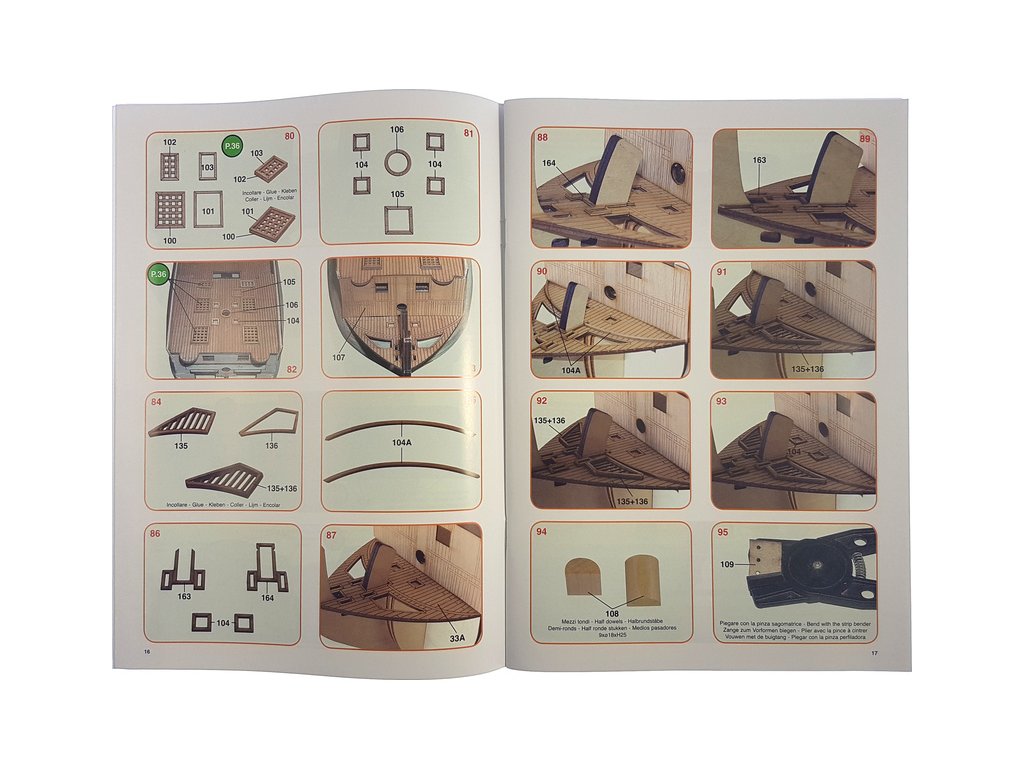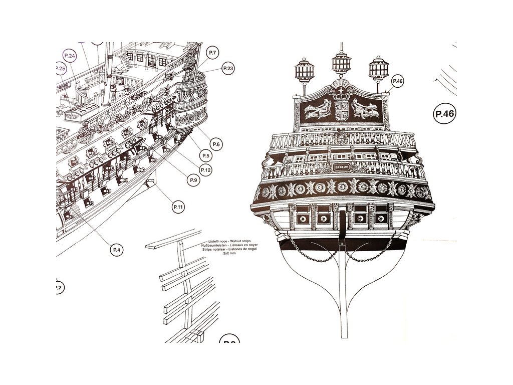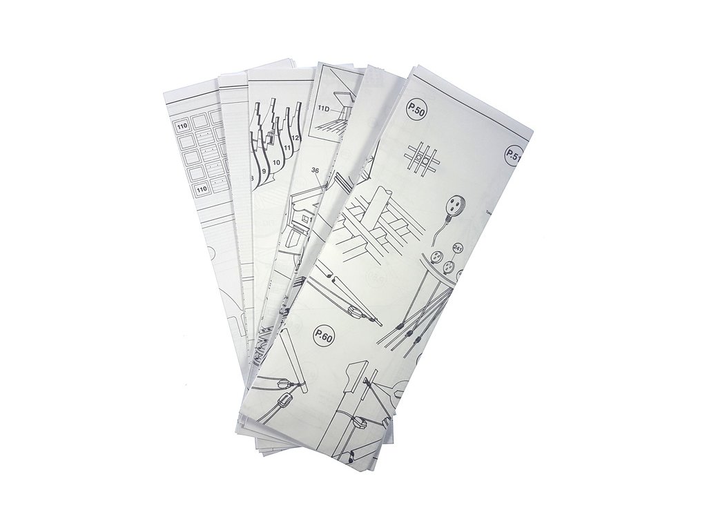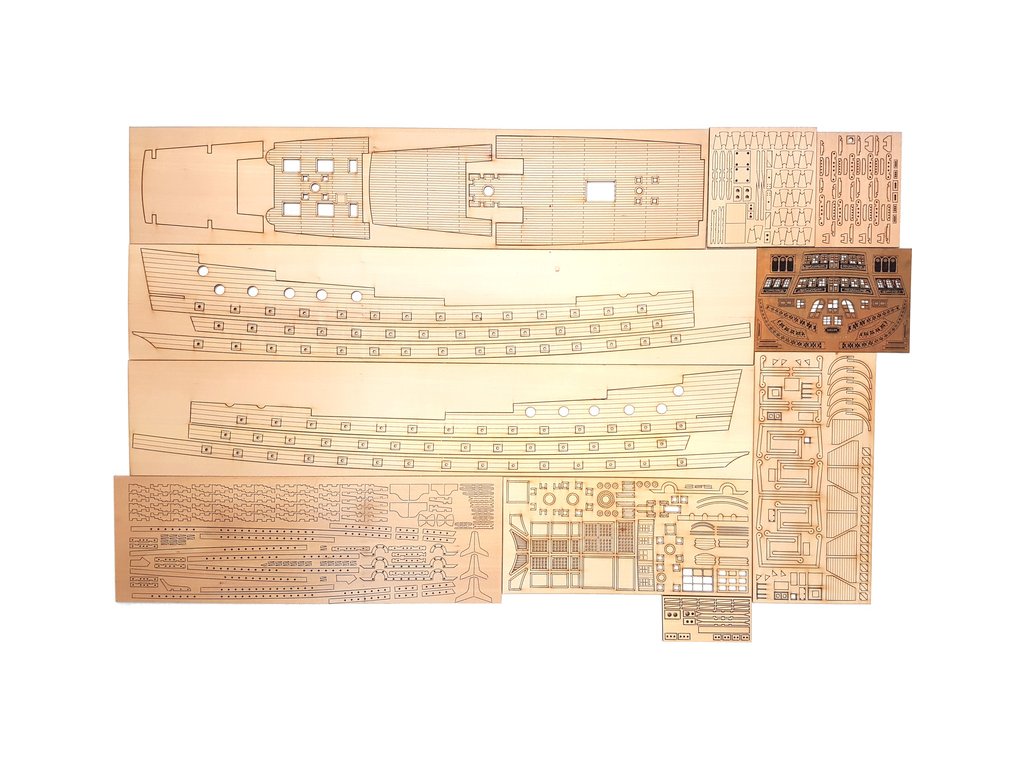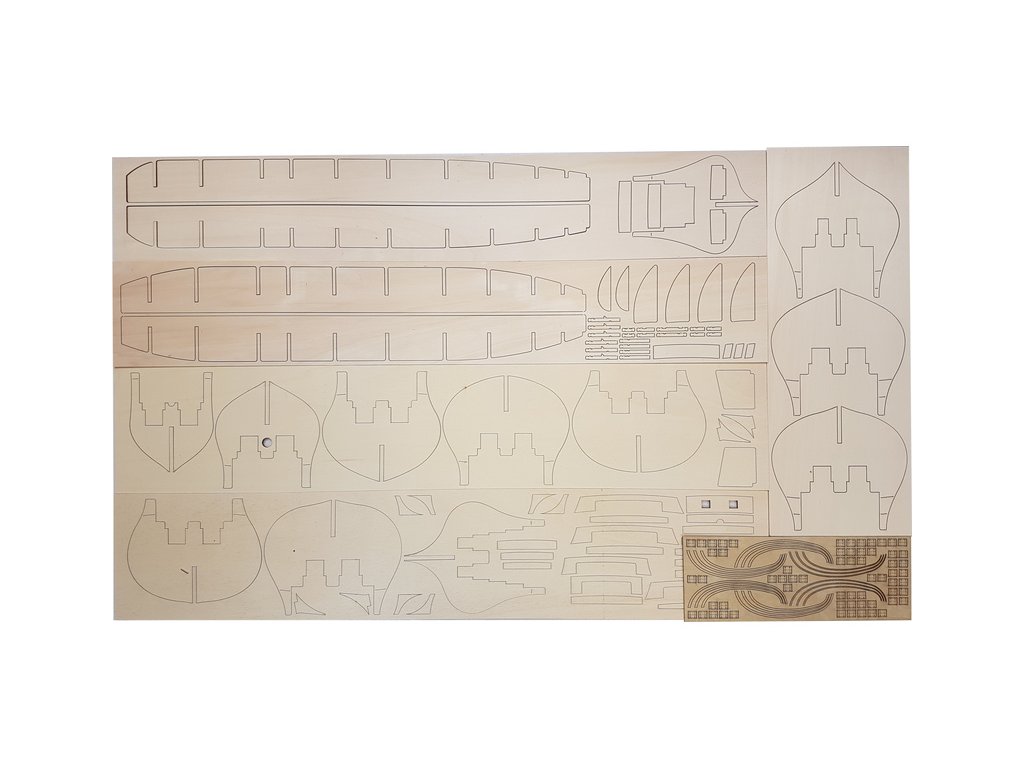Balení obsahuje laserem řezané dřevěné díly, plaňky, paluby, stožáry, vlajky, lanoví, kovové a dřevěné kování, kovové odlitky a dekorace vyleptané z mosazi. Stavební plány, vícejazyčný obrázkový návod.