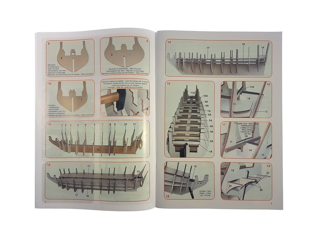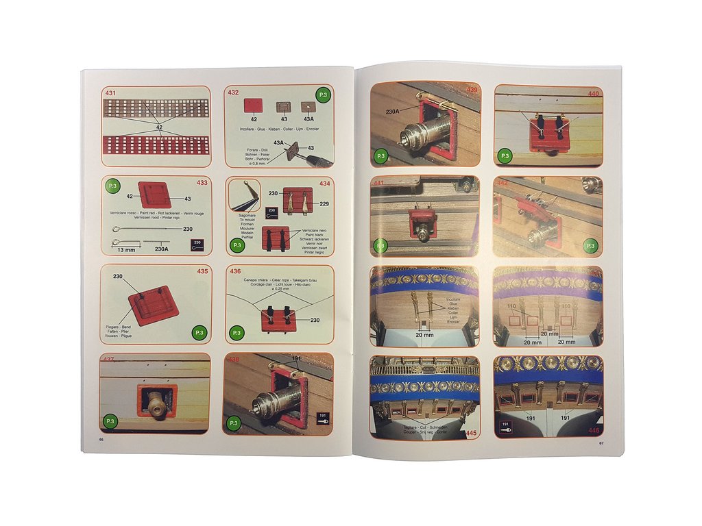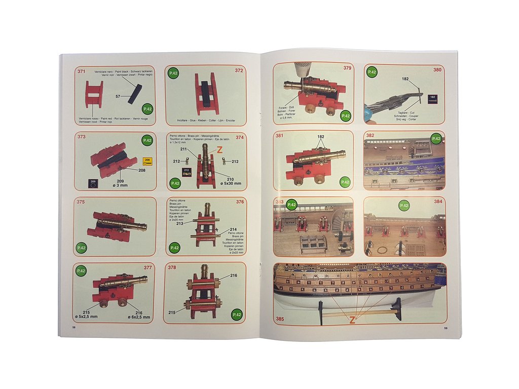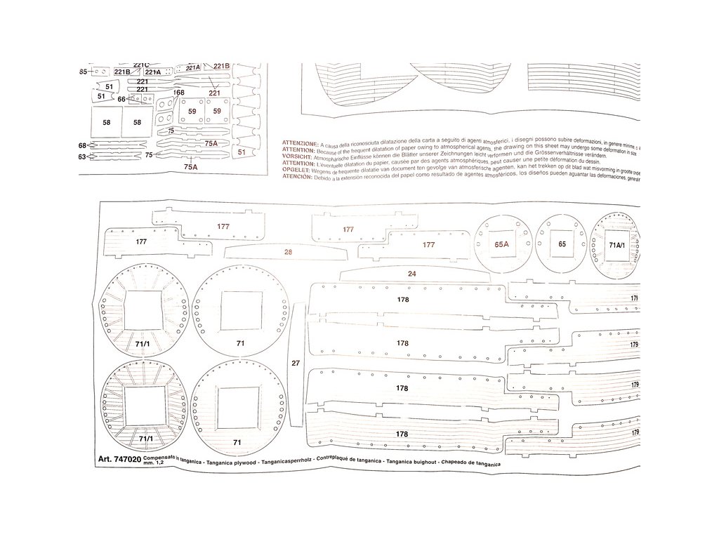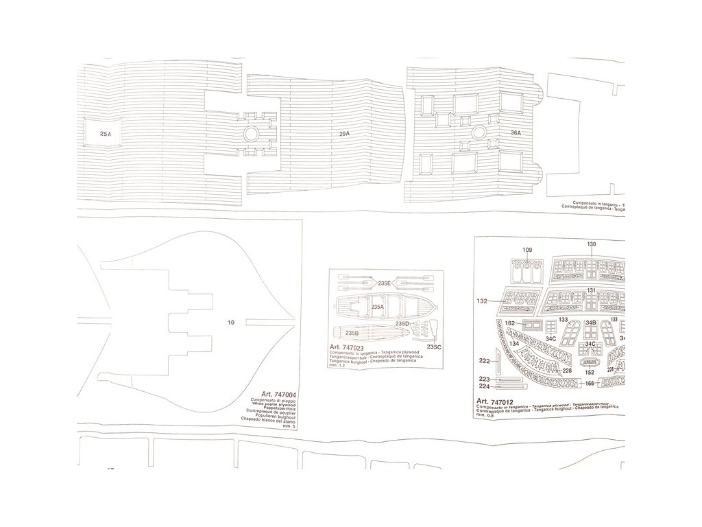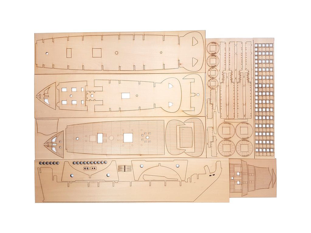 Balení obsahuje laserem řezané dřevěné díly, plaňky, paluby, stožáry, vlajky, lanoví, kovové a dřevěné kování, kovové odlitky a dekorace vyleptané z mosazi. Stavební plány, vícejazyčný obrázkový návod.