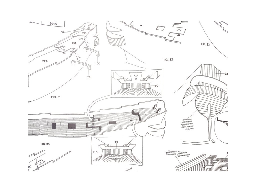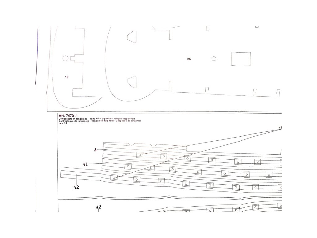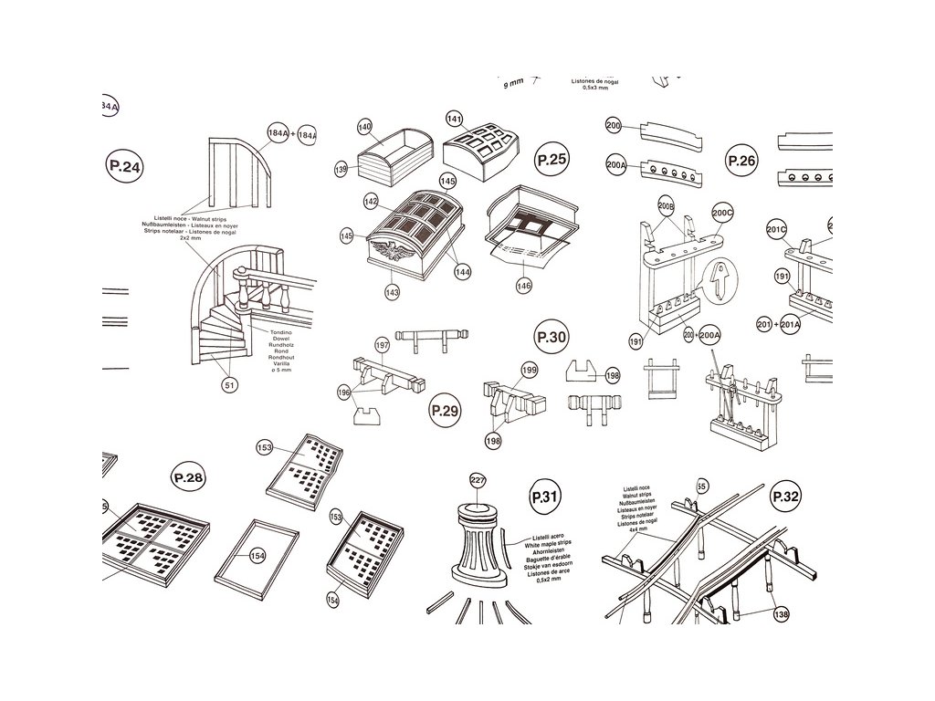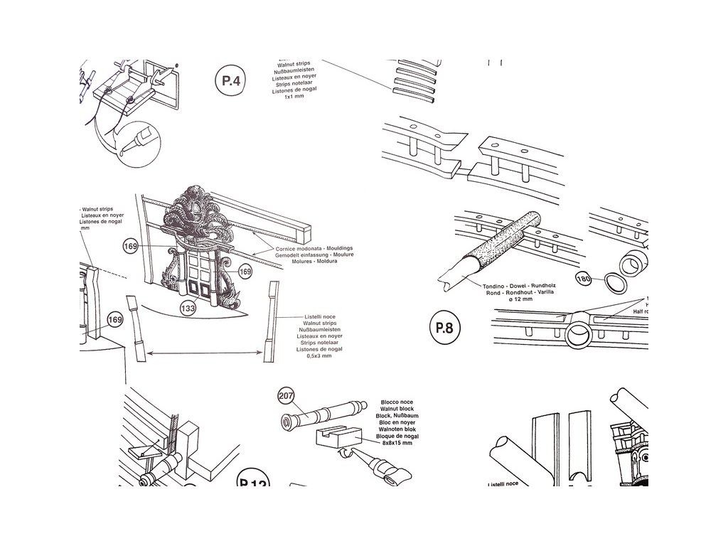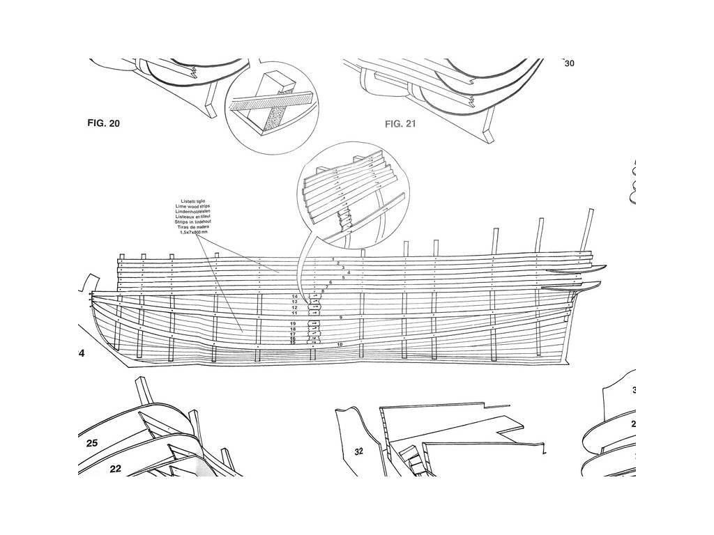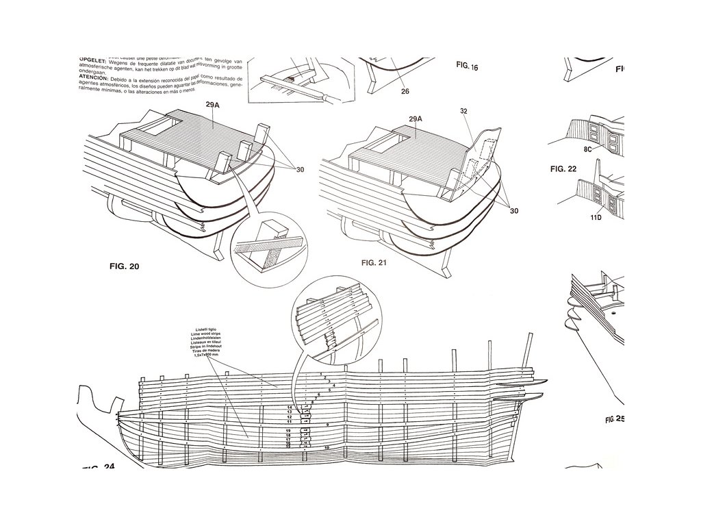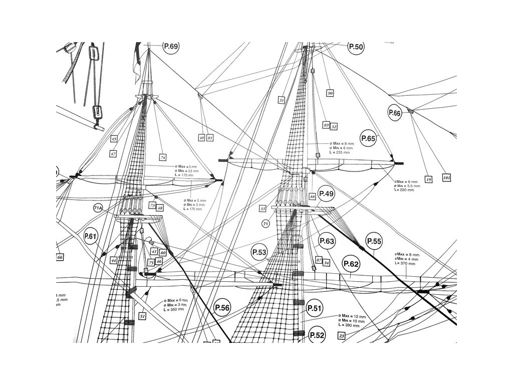 Balení obsahuje laserem řezané dřevěné díly, plaňky, paluby, stožáry, vlajky, lanoví, kovové a dřevěné kování, kovové odlitky a dekorace vyleptané z mosazi. Stavební plány, vícejazyčný obrázkový návod.