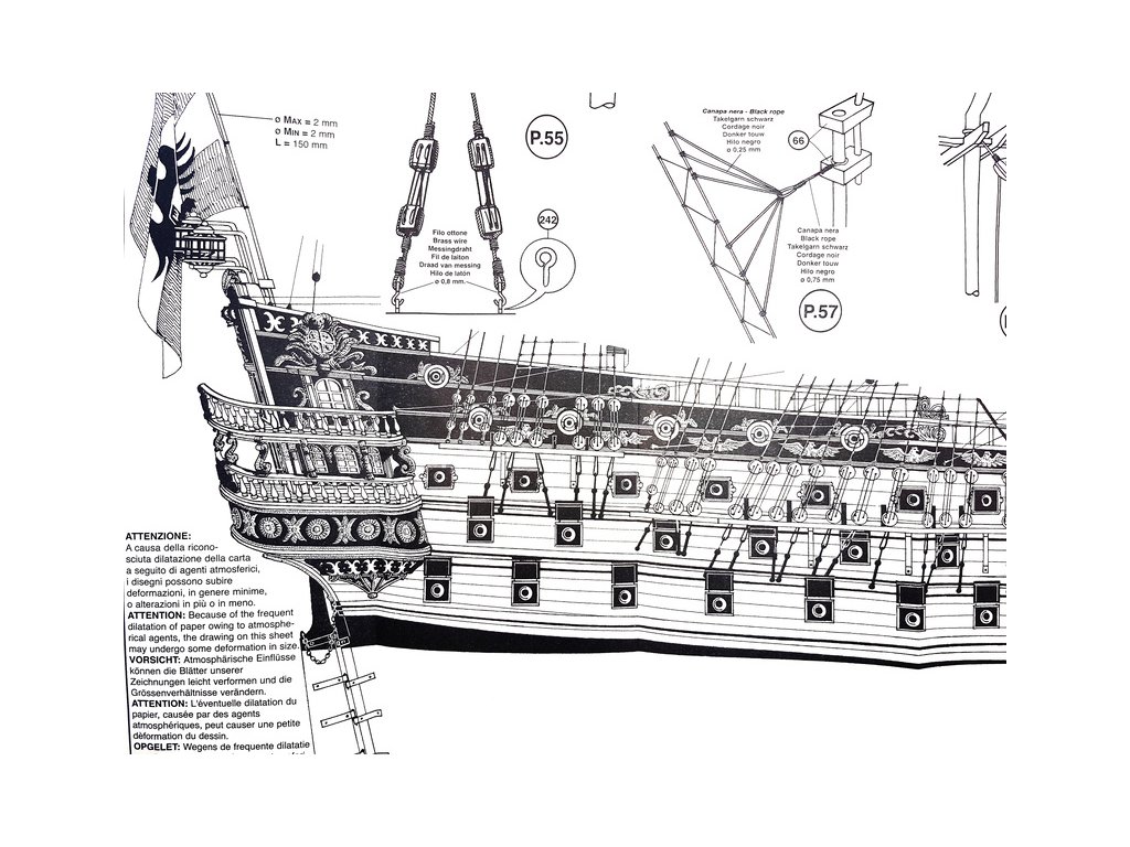 Model má dvojitou obšívku, přepážkovou konstrukci trupu, stavební plány s obecnými podrobnými anglickými pokyny, 185 masivních bronzových dílů je odlito metodou ztraceného vosku, 110 soustružených mosazných děl, dřevěné stožáry a nosníky, mosazné kování, leptané mosazné detaily, lanoví a spousta dalšího příslušenství.