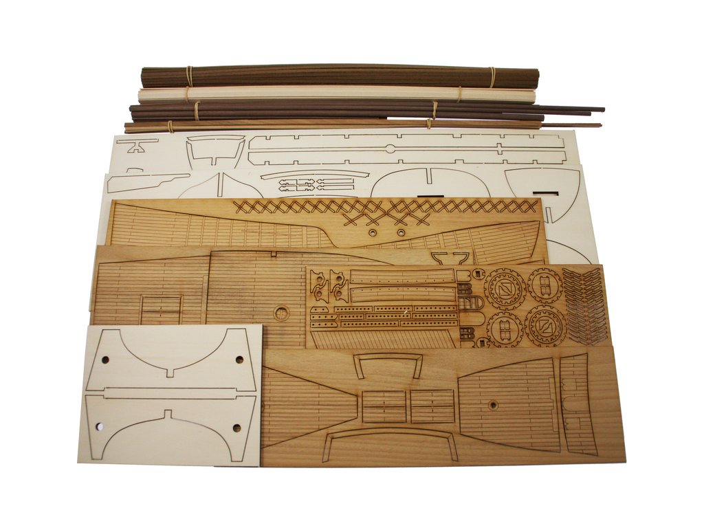 Balení obsahuje laserem řezané dřevěné díly, plaňky, paluby, stožáry, kovové a dřevěné kování, kovové odlitky a dekorace vyleptané z mosazi. Stavební plány, detailní obrázkový návod.
