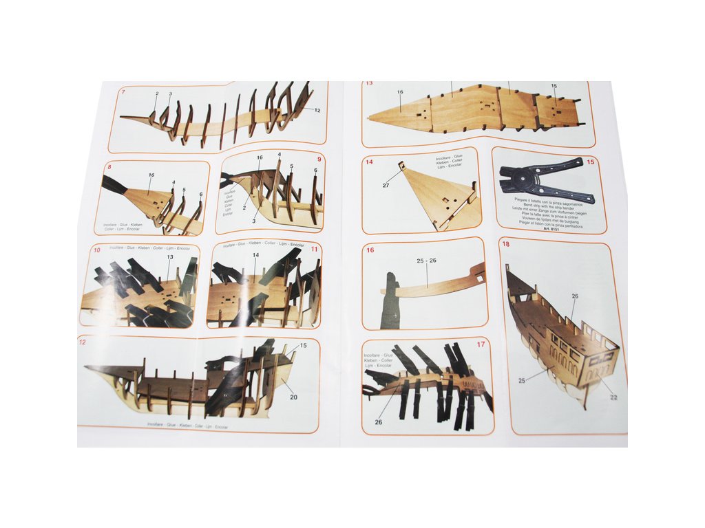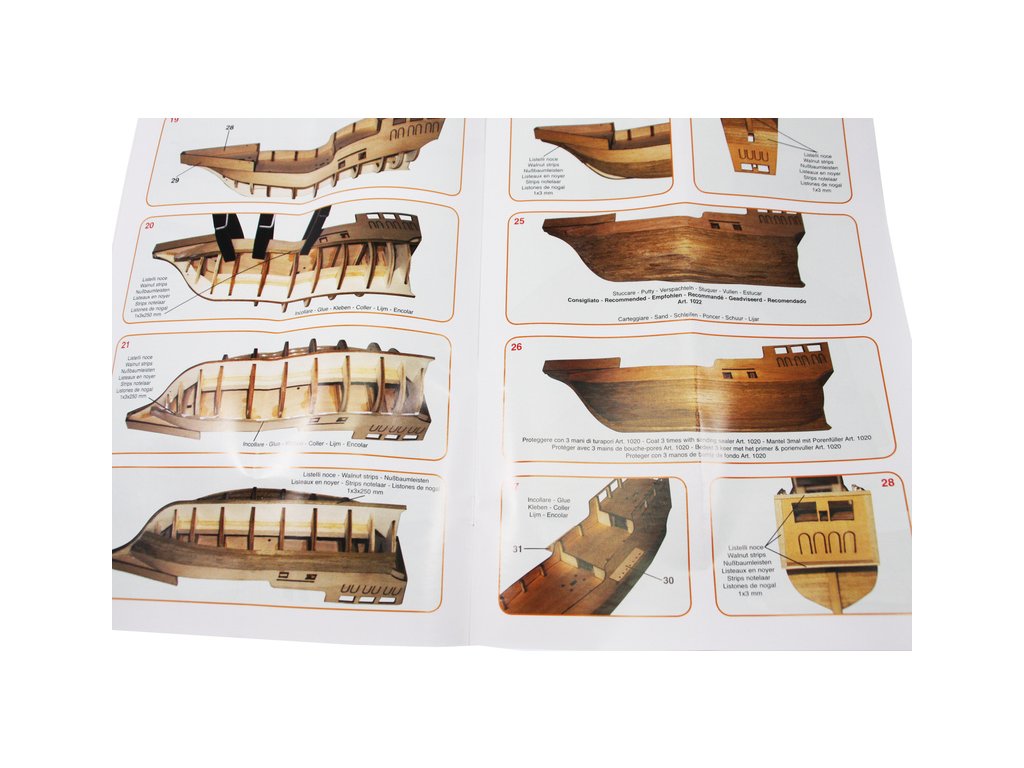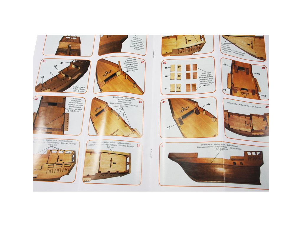 Stavebnice je vybavena přesně lícujícími dřevěnými díly řezanými laserem, potřebnými lištami a kováním. Součástí je také stojan na loď.