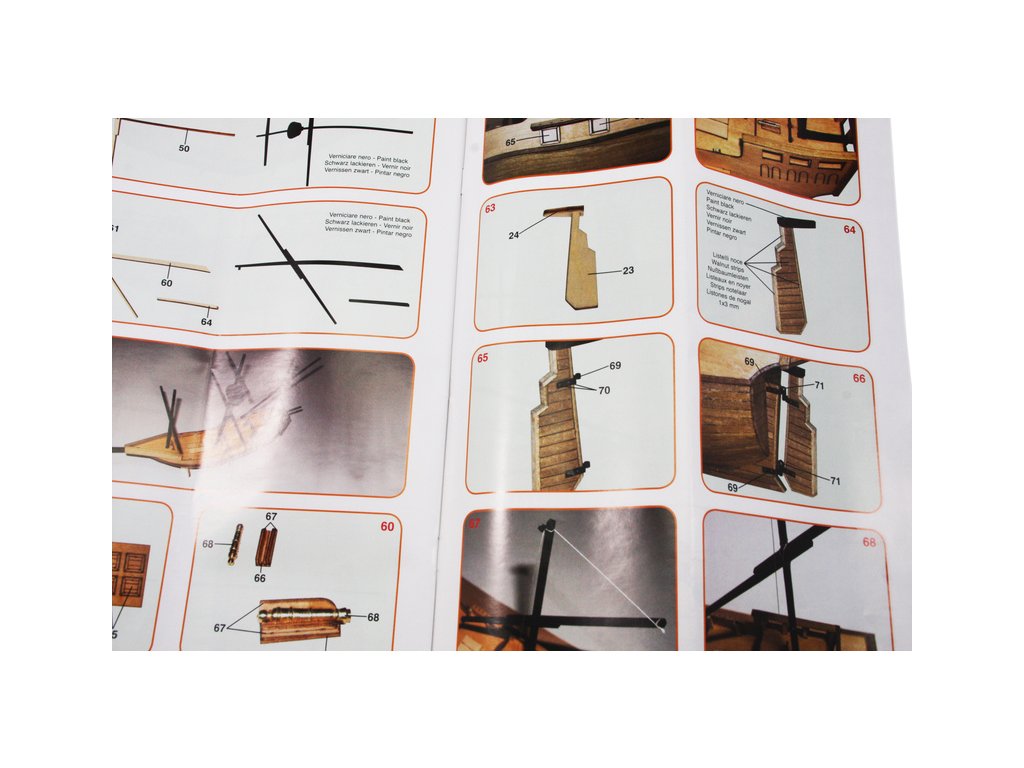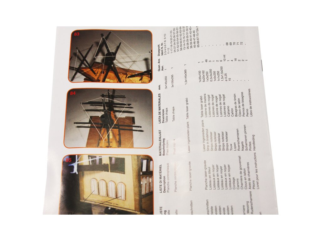 Set obsahuje kompletní sadu výkresové dokumentace modelu v měřítku 1:1 s obrázky jednotlivých detailů. Na výkrese jsou v měřítku nakresleny montážní sestavy, jejich kompletace a to včetně stěžňů a ráhen a způsob vázání lanoví. Vícejazyčný postup stavby rámcově upravuje logické sestavení jednotlivých komponentů.