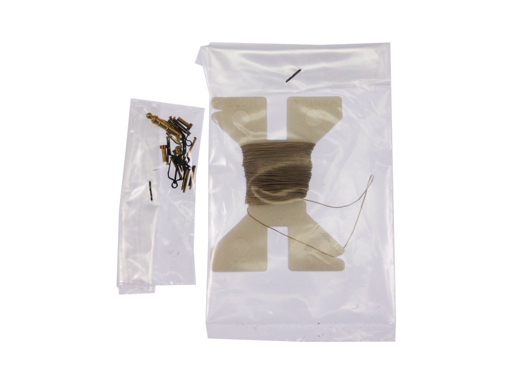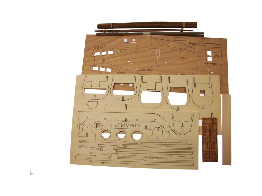 Balení obsahuje překližkové díly, dřevěné lišty, provázek na lana, drobné díly, stojánek, výkresy a podrobný obrázkový manuál.