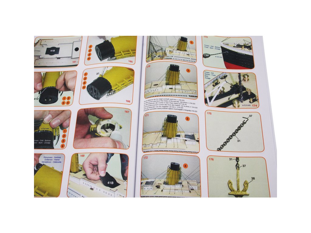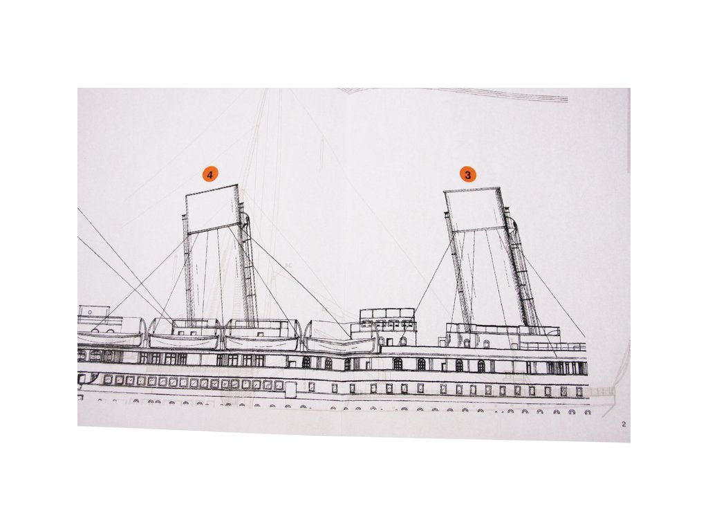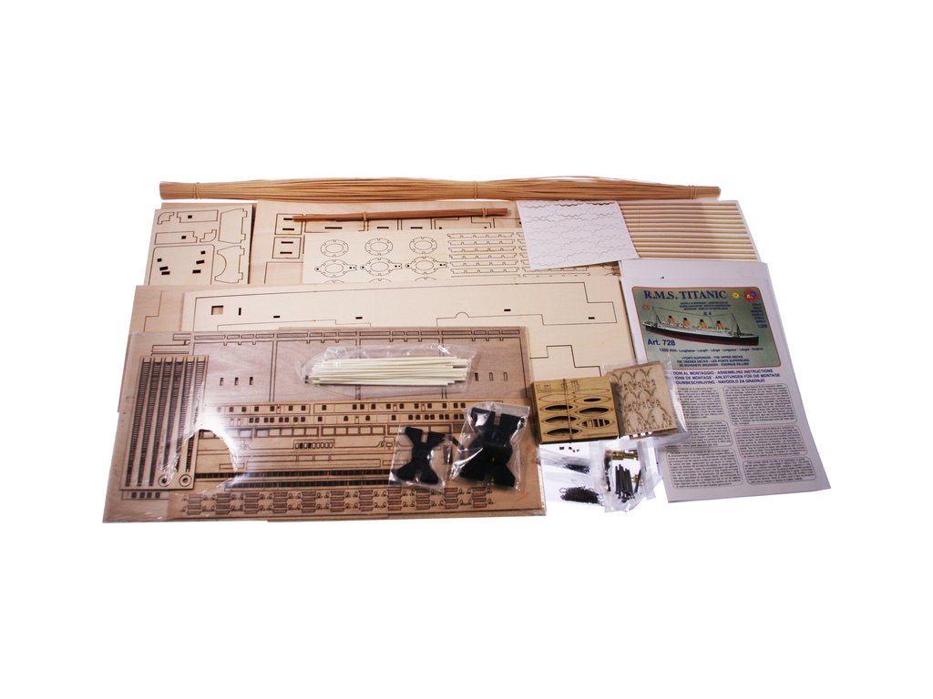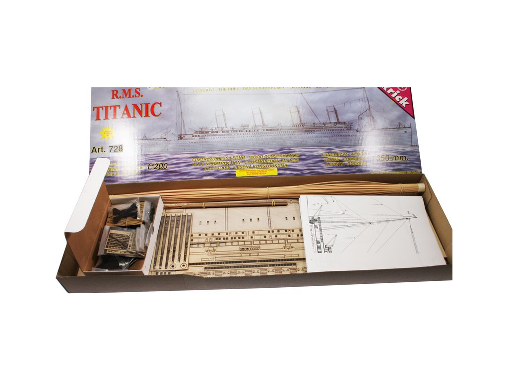 Mantua Model Titanic 1:200 sada č.4 kit v měřítku 1: 200 a délce 1350mm. Titanic je vlajkovou lodí řady Mantua Model. Bylo vybráno měřítko 1: 200 s rozměrem trupu 1350 mm na délku a 140 mm na šířku pro možnost podrobného zpracování detailů. Titanic je dodáván ve dvou verzích statických nebo v provedení RC. Aby modelář mohl stavět postupně, je stavebnice rozčleněna do 5 samostatně prodejných sad. Můžete si zakoupit kompletní sadu nebo jednotlivé sety podle vlastní potřeby. Sada se skládá z 5 částí, z nichž první (KR-800725) je trup a přední a zadní paluba, druhá sada (KR-800726) je balíček motorů pro instalaci funkčního rádiové ovládání, třetí sada (KR-800727) jsou boční panely oken trupu, přídě a zádi, detaily a kování, čtvrtá sada (KR-800728) je střední paluba včetně komínů a pátá (KR-800730) je kompletní sada kování. Konstrukce je obecně z přepážek na kýlu s laserem řezanými a leptanými dřevěnými detaily. Součástí je anglický návod a foto detaily.
