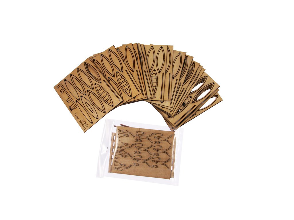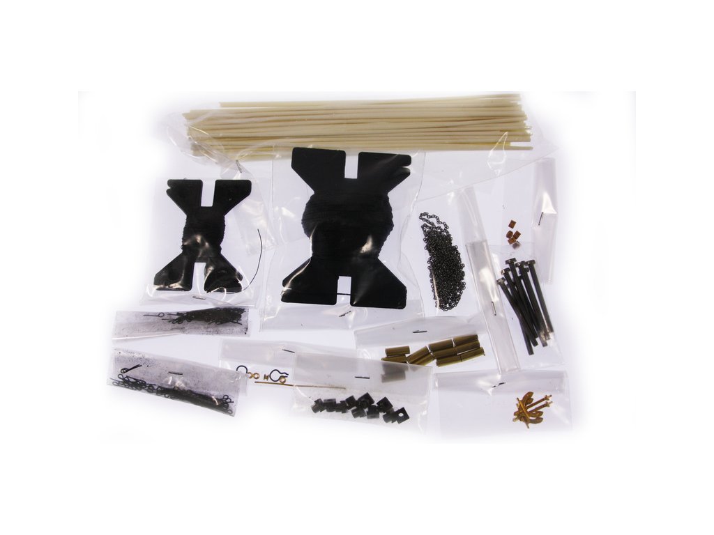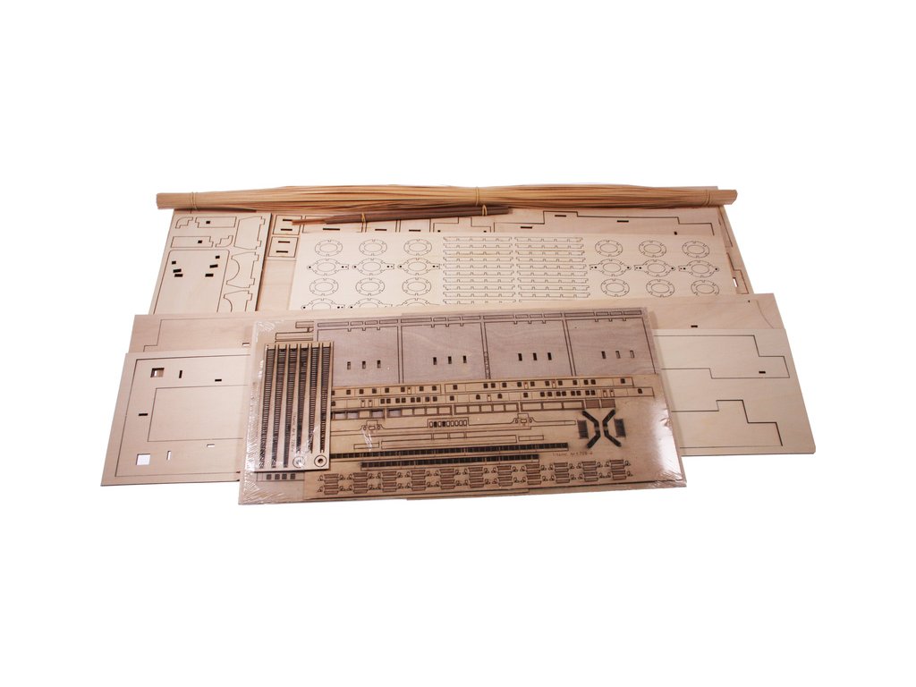Balení obsahuje sadu překližkových dílů, sadu dřevěných lišt o různém průřezu, sáčky s drobnými díly, díly z mosazi, sadu výkresů a vícejazyčný manuál.