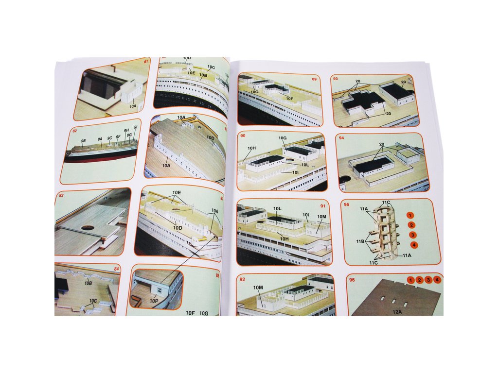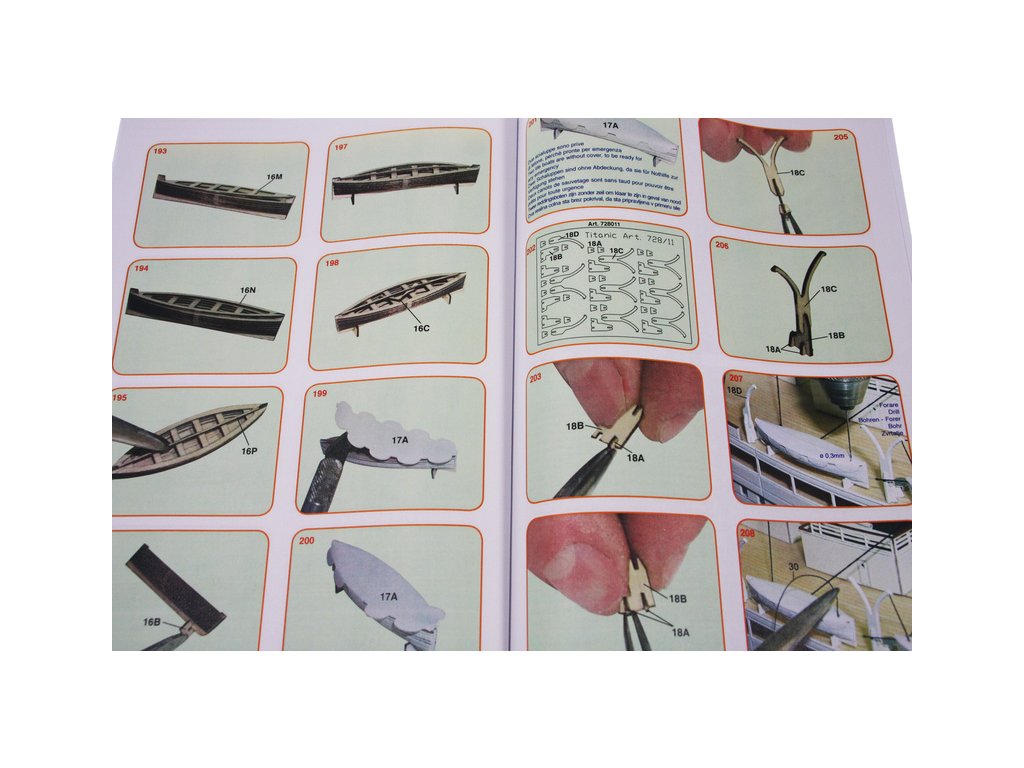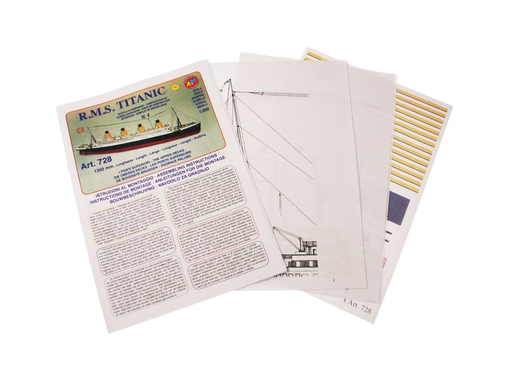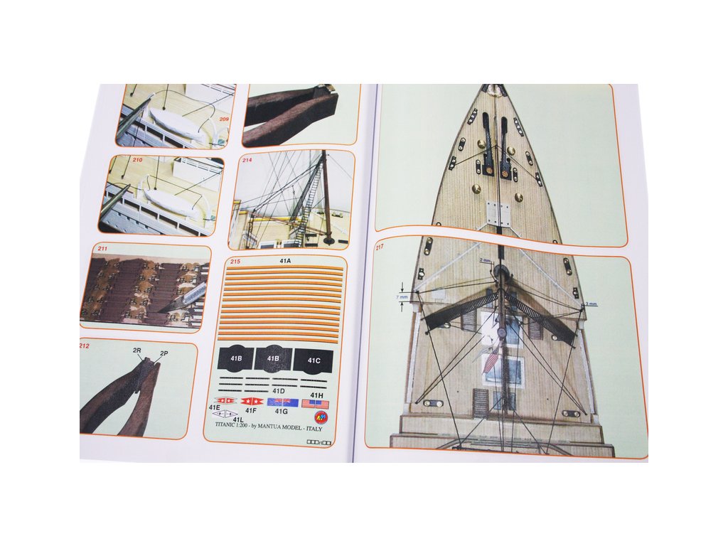 Mantua Model Titanic 1:200 sada č.4 kit v měřítku 1: 200 a délce 1350mm. Titanic je vlajkovou lodí řady Mantua Model, který se sestaví z 5 setů. Sada č.4 obsahuje nástavby střední části trupu, záchranné čluny,detaily a kování. Součástí je anglický návod a foto detaily.