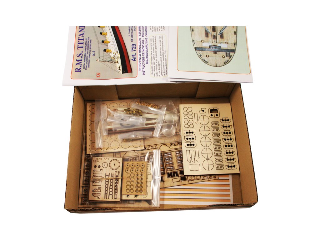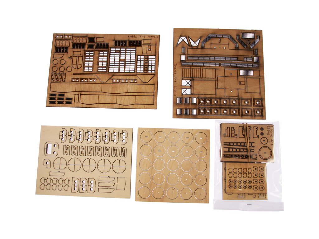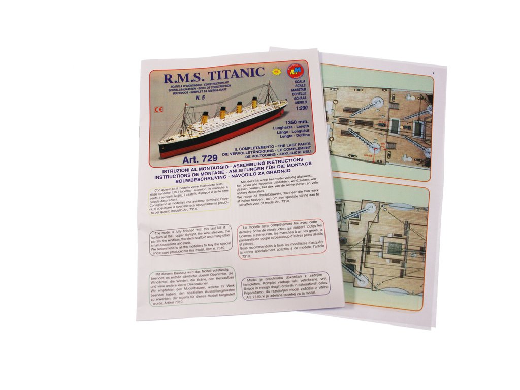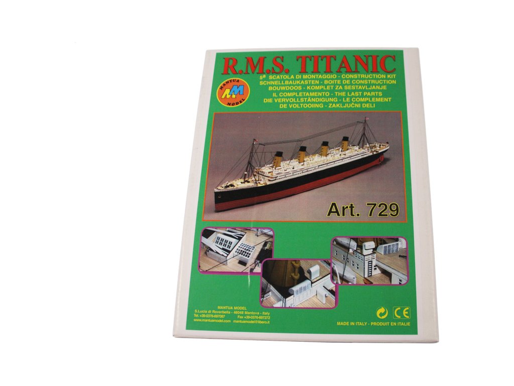 Mantua Model Titanic 1:200 sada č.5 kit v měřítku 1: 200 a délce 1350mm. Titanic je vlajkovou lodí řady Mantua Model. Bylo vybráno měřítko 1: 200 s rozměrem trupu 1350 mm na délku a 140 mm na šířku pro možnost podrobného zpracování detailů. Titanic je dodáván ve dvou verzích statických nebo v provedení RC. Aby modelář mohl stavět postupně, je stavebnice rozčleněna do 5 samostatně prodejných sad. Můžete si zakoupit kompletní sadu nebo jednotlivé sety podle vlastní potřeby. Sada se skládá z 5 částí, z nichž první (KR-800725) je trup a přední a zadní paluba, druhá sada (KR-800726) je balíček motorů pro instalaci funkčního rádiové ovládání, třetí sada (KR-800727) jsou boční panely oken trupu, přídě a zádi, detaily a kování, čtvrtá sada (KR-800728) je střední paluba včetně komínů a pátá (KR-800730) jsou součásti k dokončení palub a nástaveb, sada kování.. Konstrukce je obecně z přepážek na kýlu s laserem řezanými a leptanými dřevěnými detaily. Součástí je anglický návod a foto detaily.