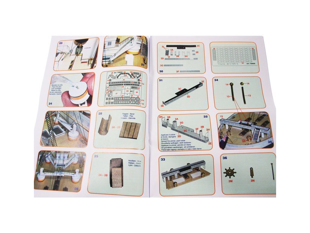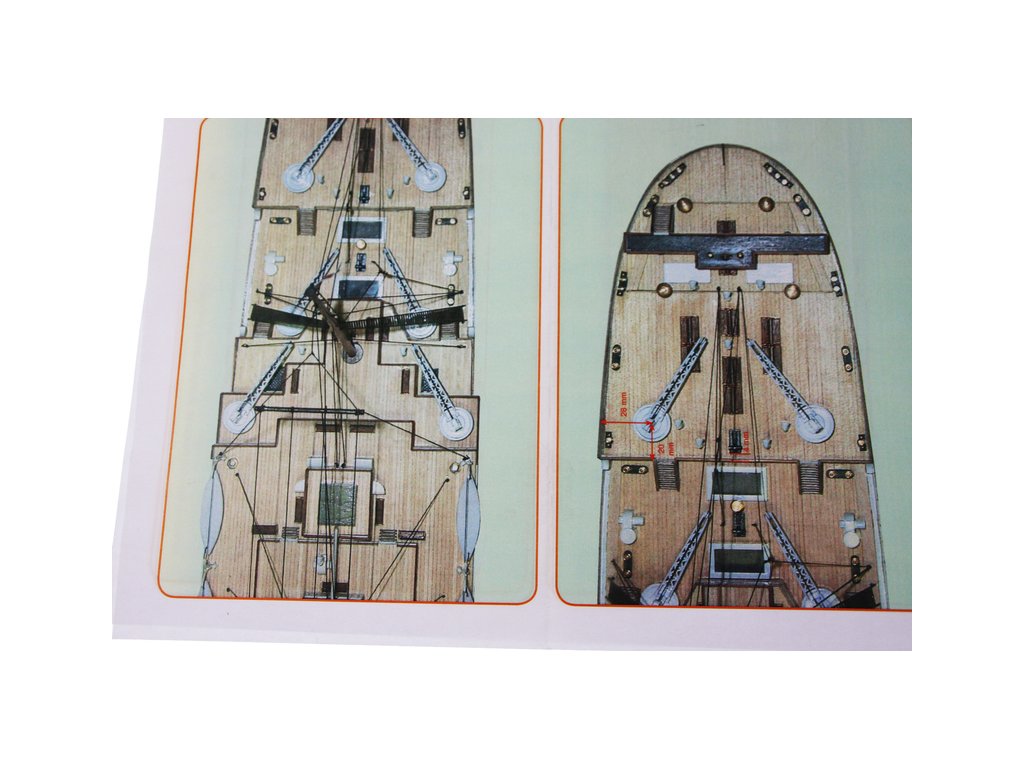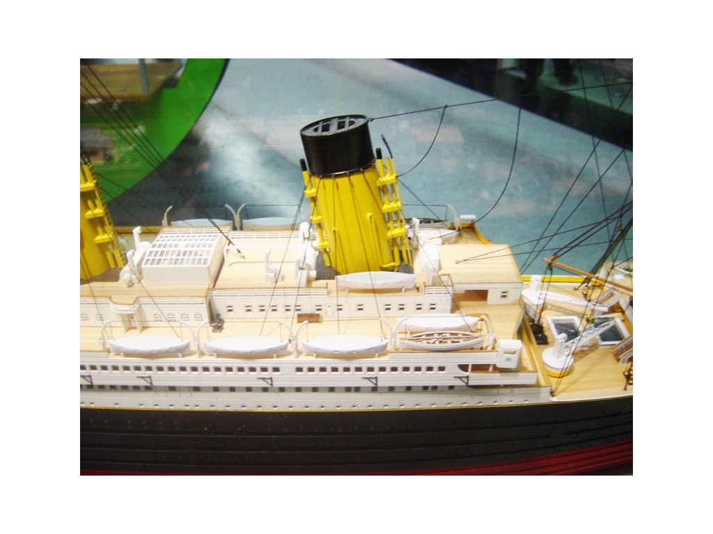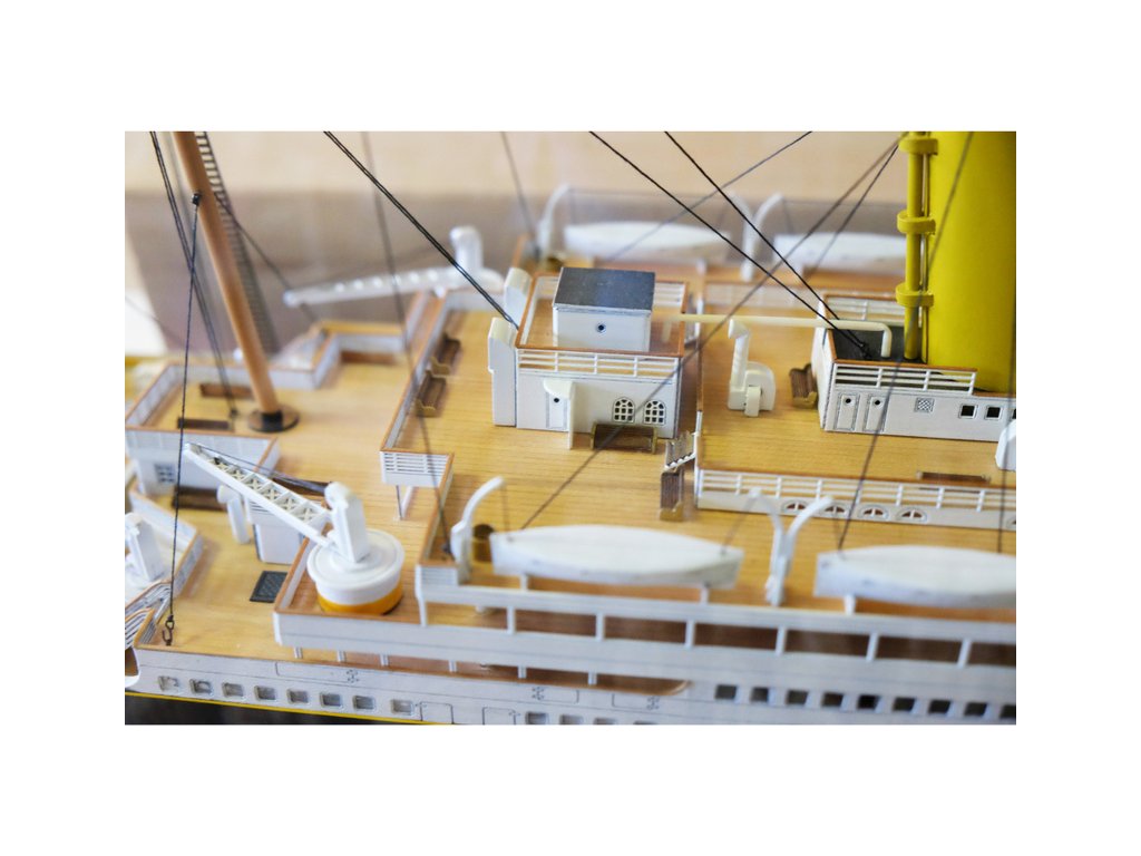 Mantua Model Titanic 1:200 sada č.5 kit v měřítku 1: 200 a délce 1350mm. Titanic je vlajkovou lodí řady Mantua Model. Bylo vybráno měřítko 1: 200 s rozměrem trupu 1350 mm na délku a 140 mm na šířku pro možnost podrobného zpracování detailů. Titanic je dodáván ve dvou verzích statických nebo v provedení RC. Aby modelář mohl stavět postupně, je stavebnice rozčleněna do 5 samostatně prodejných sad. Můžete si zakoupit kompletní sadu nebo jednotlivé sety podle vlastní potřeby. Sada se skládá z 5 částí, z nichž první (KR-800725) je trup a přední a zadní paluba, druhá sada (KR-800726) je balíček motorů pro instalaci funkčního rádiové ovládání, třetí sada (KR-800727) jsou boční panely oken trupu, přídě a zádi, detaily a kování, čtvrtá sada (KR-800728) je střední paluba včetně komínů a pátá (KR-800730) jsou součásti k dokončení palub a nástaveb, sada kování.. Konstrukce je obecně z přepážek na kýlu s laserem řezanými a leptanými dřevěnými detaily. Součástí je anglický návod a foto detaily.