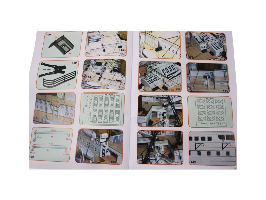 Mantua Model Titanic 1:200 sada č.5 kit v měřítku 1: 200 a délce 1350mm. Titanic je vlajkovou lodí řady Mantua Model, který se sestaví z 5 setů. Sada č.5 obsahuje součásti k dokončení palub a nástaveb, sada kování. Součástí je anglický návod a foto detaily.