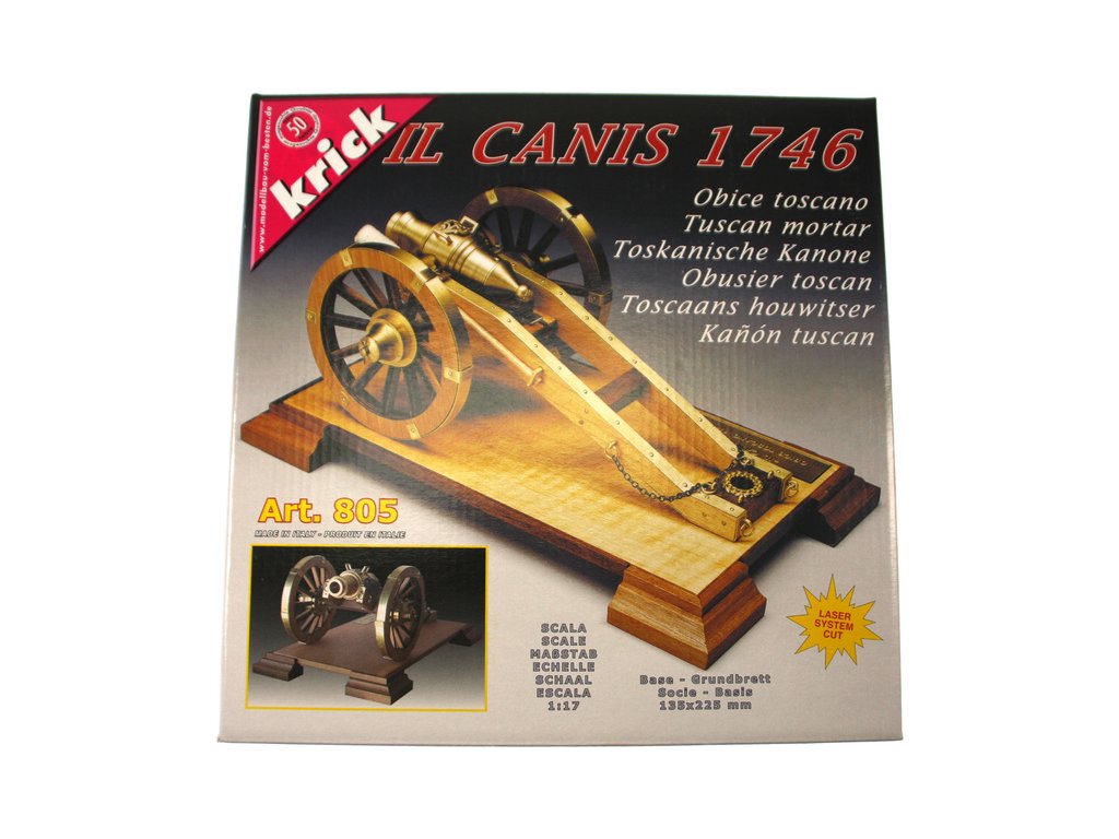 Stavebnice modelu Toskánského kanónu v měřítku 1:17. Dělo z roku 1746 bylo použito v mnoha pozemních bitvách. Bylo taženo koňmi a díky tomu bylo snadno přemístitelné. Poskytovalo devastující účinek především na kratší vzdálenosti. Konstrukce se skládá z předem nařezaných dřevěných dílů a kovových litých ozdob.