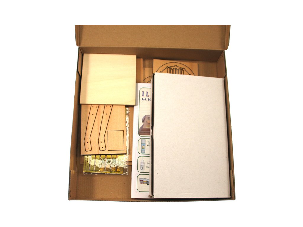 Po otevření víka krabice naleznete dřevěné díly modelu z překližky, lišty, drobné součásti v plastových sáčcích a manuál.