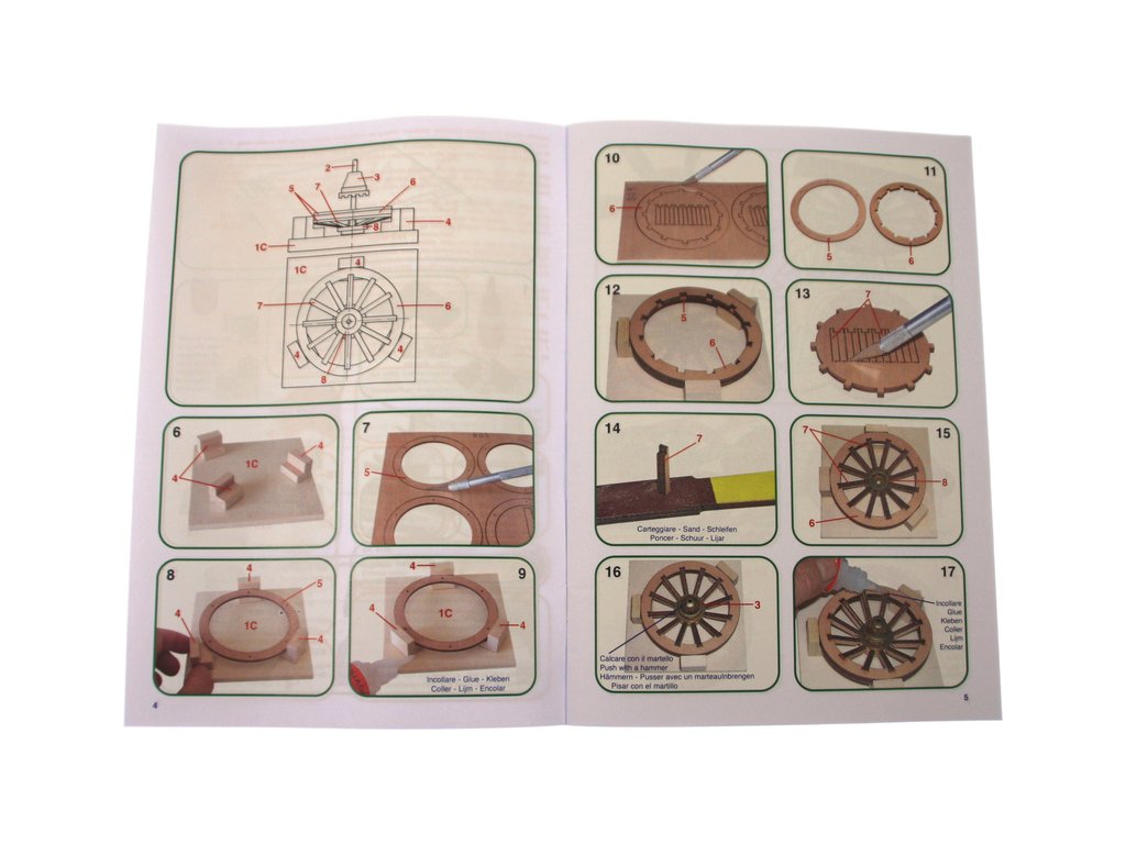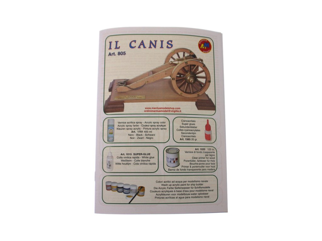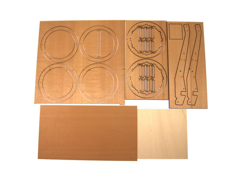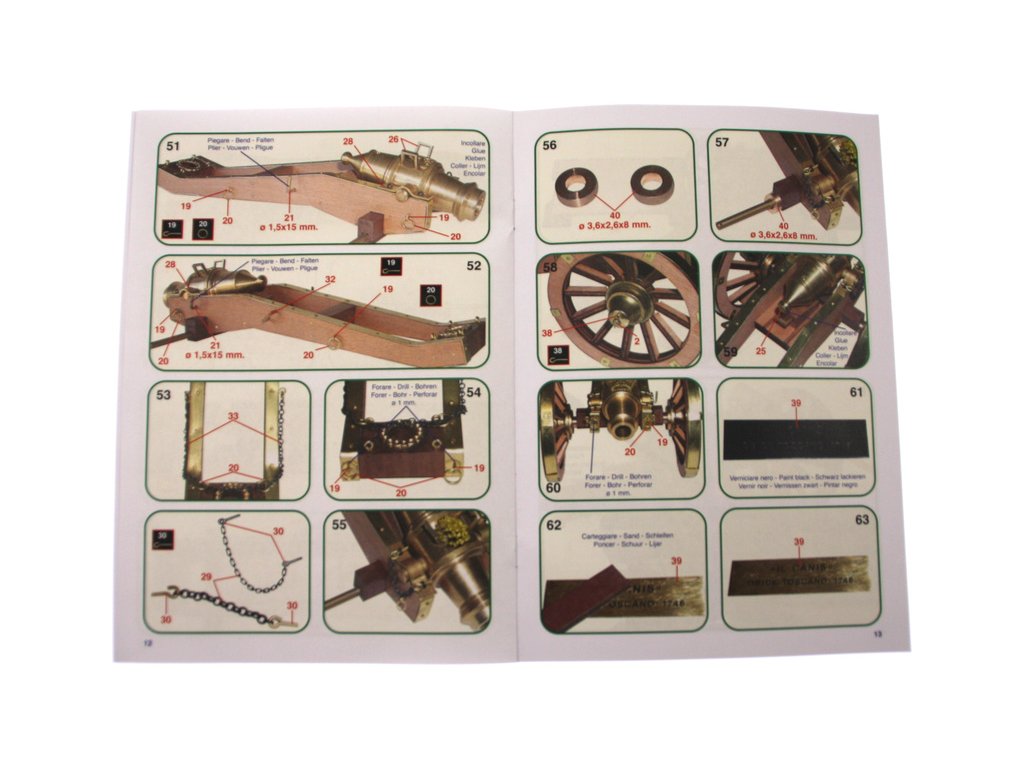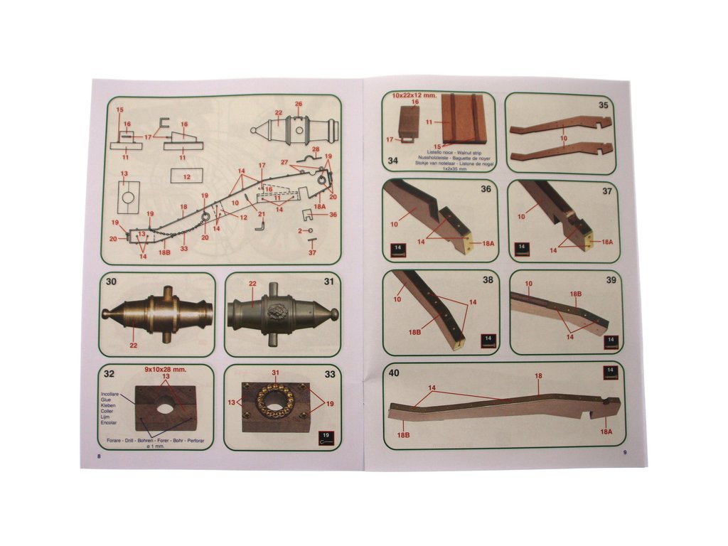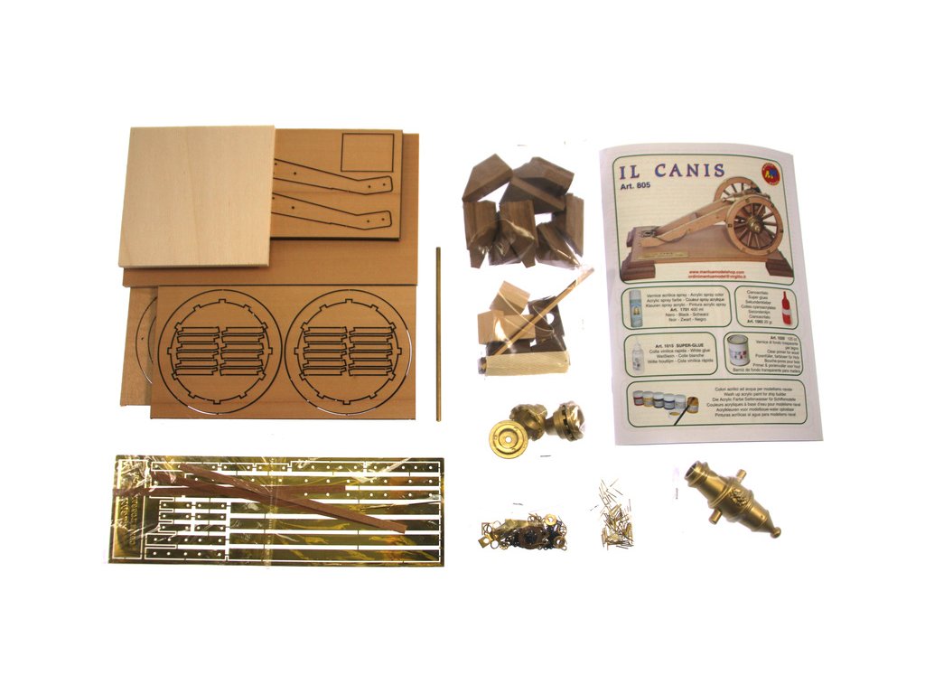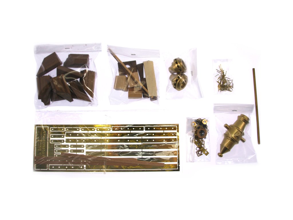 Balení obsahuje laserem vyřezávané dřevěné díly mosaznou hlaveň, kovové odlitky, obrázkový návod ke stavbě.