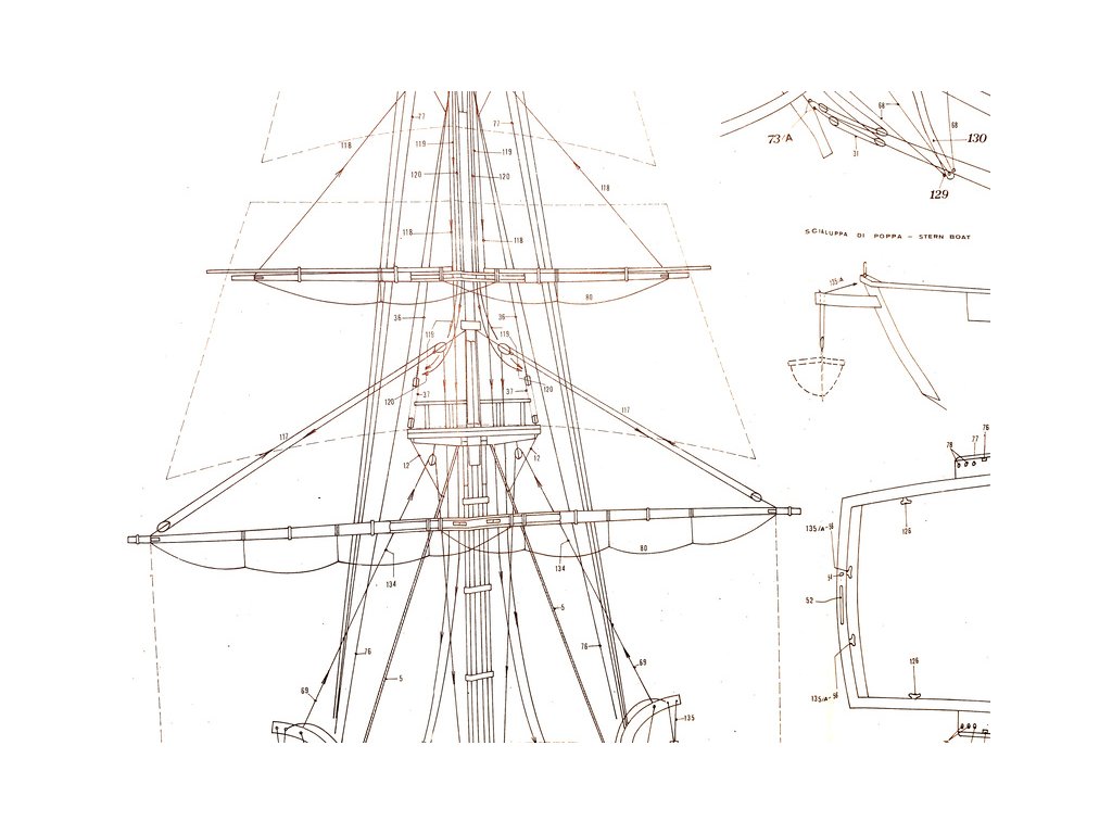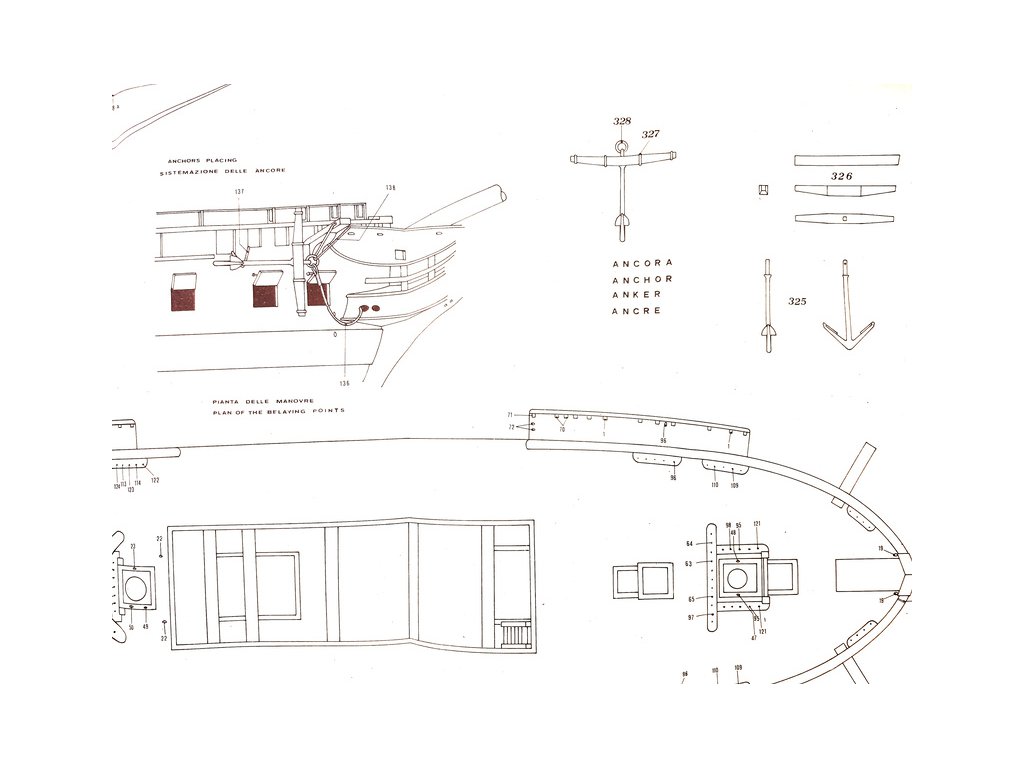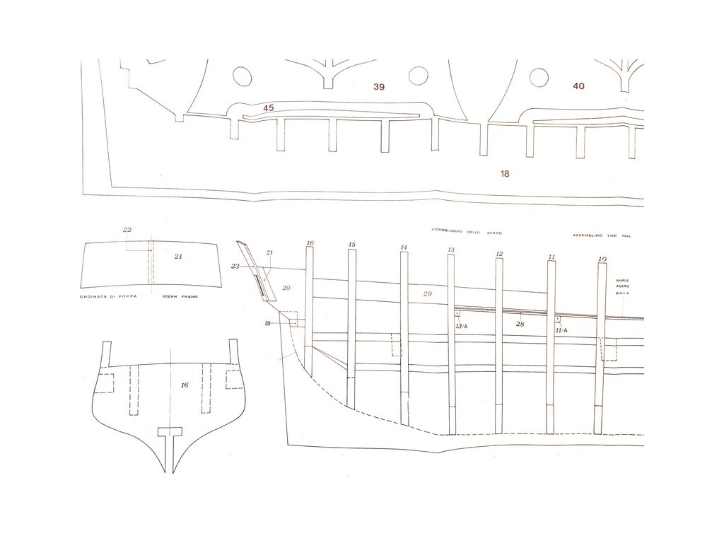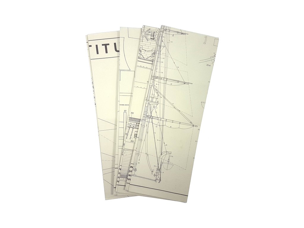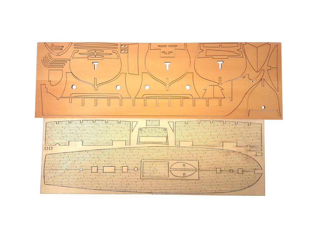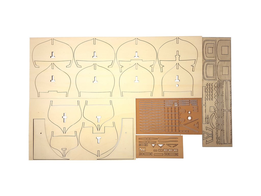Balení obsahuje sadu překližkových dílů, sadu dřevěných lišt, sáčky s drobnými díly, díly z mosazi, sadu výkresů a vícejazyčný manuál.