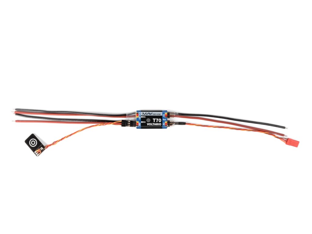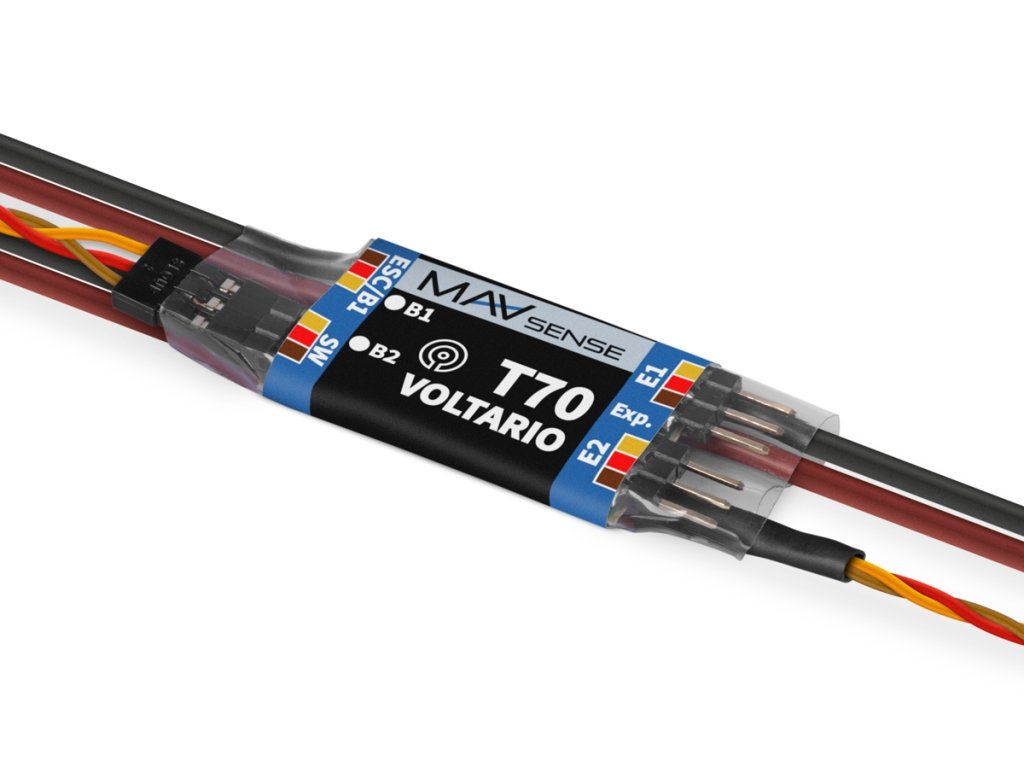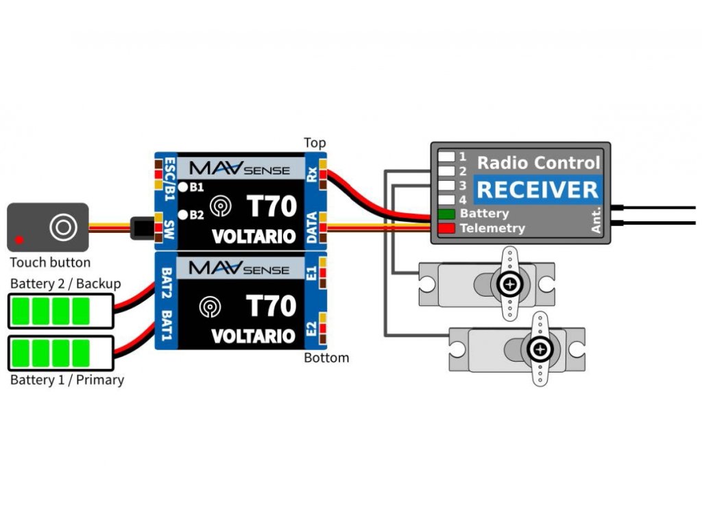 Voltario T70 představuje výkonný digitální systém pro zálohu napájení, jenž nabízí i pokročilé telemetrické funkce. Obsahuje nabíjecí obvod a funkci dotykového vypínače. Zařízení je ideální pro středně velké modely, kde se používají např. HV serva napřímo bez stabilizace napětí.Voltario T70 je vhodné pro modely vybavené buď dvěma přijímačovými bateriemi, případně regulátorem se stabilizací napětí (BEC) v kombinaci s malou záložní baterií. Zařízení preferuje svůj primární bateriový vstup (až 3S LiPo), přičemž v případě poklesu napětí se automaticky přepne na sekundární vstup. Nabíjecí obvod může být volitelně aktivován pro nabíjení záložní baterie z primárního vstupu/obvodu BEC.