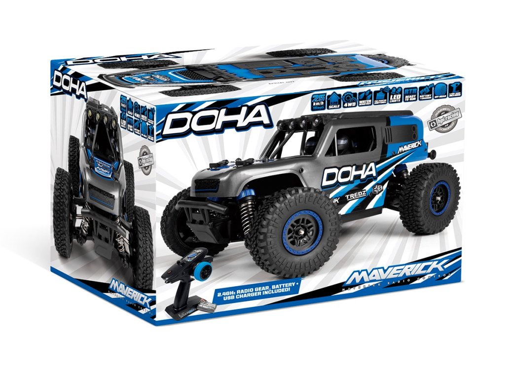 Součástí balení modelu DOHA je 600mAh li-ion akumulátor Maverick Element, praktický USB nabíječ, 2,4GHz rádiový systém MTX-201, voděodolný 2v1 přijímač/regulátor MSRS-201. Model DOHA je navíc vybaven střešními LED světly, která umožňují provoz za zhoršených světelných podmínek.