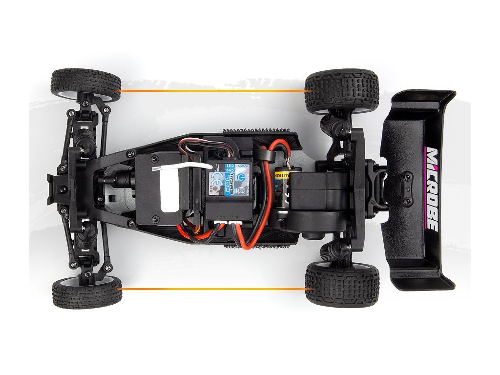 Elegantní 1,5 mm eloxované hliníkové plato podvozku, osazení kuličkovými ložisky a plynulá 3kolová zadní převodovka společně dodávají modelu Microbe stabilní a přesný pocit z jízdy. Přidejte olejové tlumiče a odvětrávaná kola s pěnovými vložkami a získáte malou buggy, která miluje zatáčky, pohlcuje nerovnosti a s jistotou vystřeluje ze zatáček.