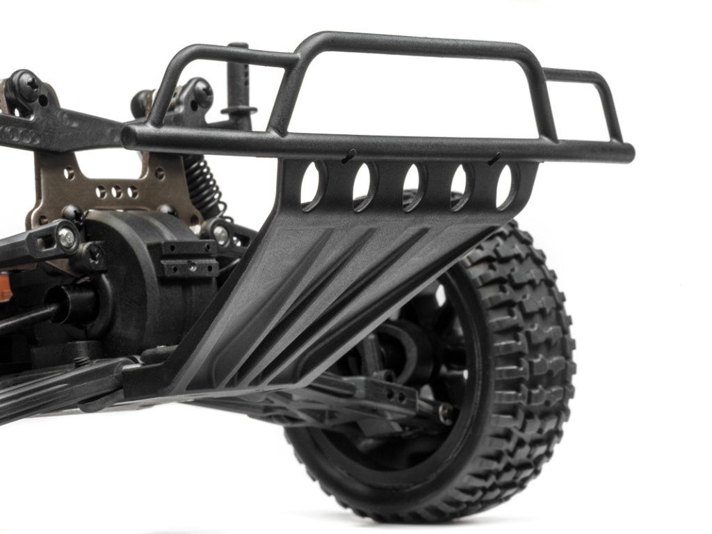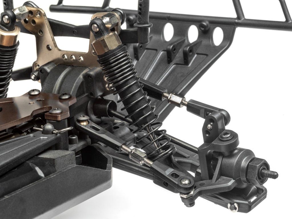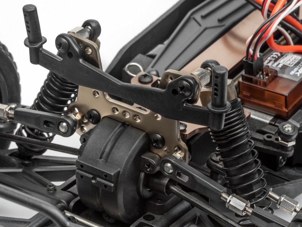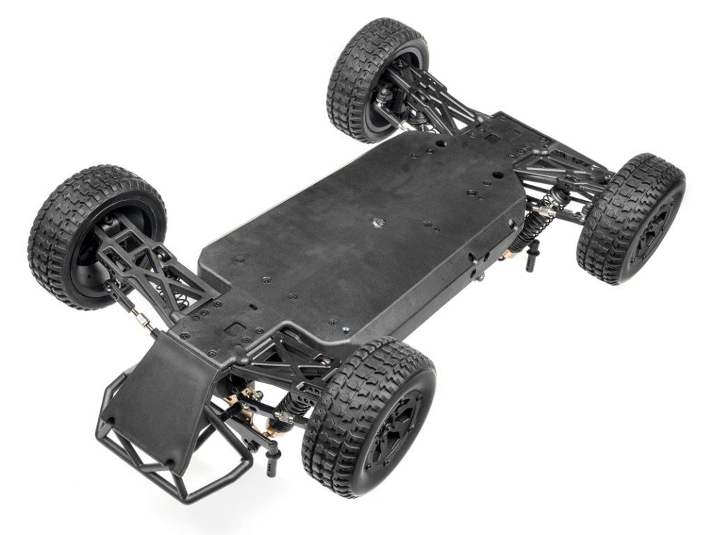 Konstrukce s "bočnicemi zajišťuje dostatečnou pevnost, které napomáhá horní výztuha. Z důvodu co nejlepšího vyvážení je váha pohonného akumulátoru a motoru soustředěna na střed šasi. Stálý převod je opatřen účinným zakrytováním, který chrání převod před poškozením o prachu a kamínků. Diferenciály jsou planetové uložené v kuličkových ložiscích stejně, jako náboje kol apod. Kola jsou nezávisle zavěšena na lichoběžníkových ramenou a odpružena olejovými tlumiči. Geometrie je nastavitelná pomocí spojovacích tyčí s pravo-levým závitem. K ovládání je použita volantová RC souprava v pásmu 2,4Ghz