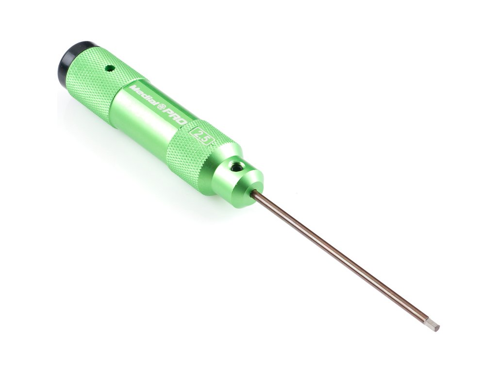 Kvalitní CNC imbus šroubovák Medial Pro o velikosti 2.5 mm má hliníkovou rukojeť o délce 97 mm a průměru 21 mm s gumovou opěrkou a dřík o délce 83 mm . Atraktivní balení v plastové krabičce.