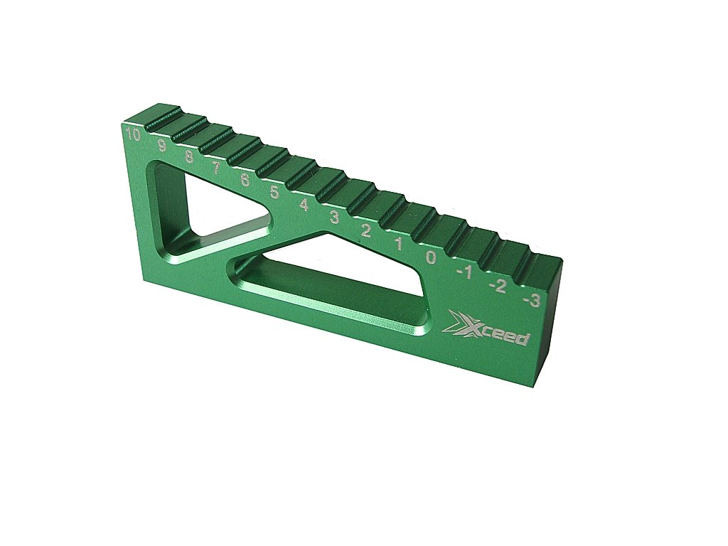 Lehký hliníkový nástroj pro měření propadu ramen. Laserem gravírované s výškou od -3 do 10mm v krocích po 1mm. Na boku vyryté logo Xceed.