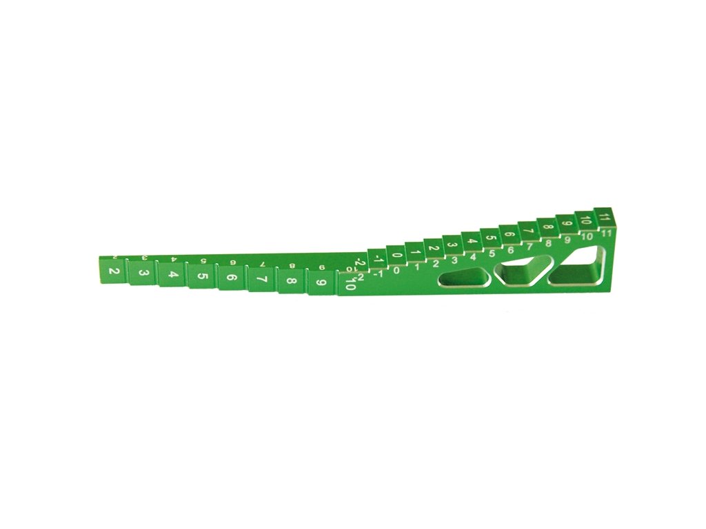 Nástroj pro měření jízdní výšky/světlé výšky, obráběný a eloxovaný, s jasnou indikací velikosti na obou stranách.