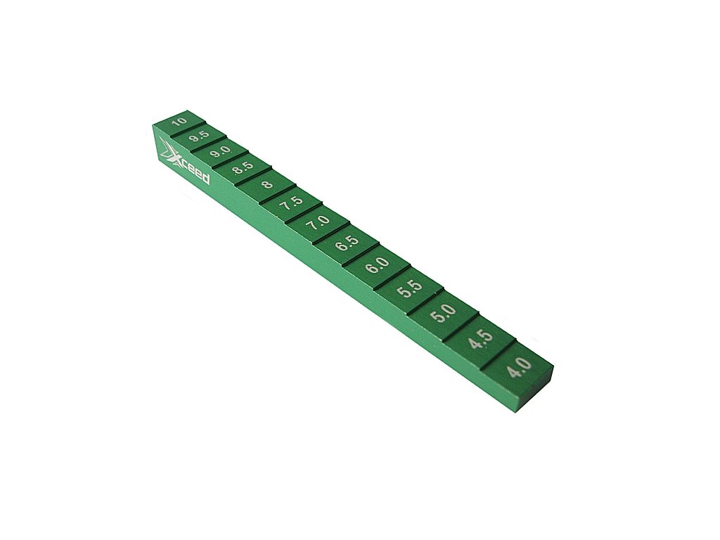 Lehký hliníkový nástroj pro měření světlé výšky. Laserem gravírované s výškou od 4 do 10 krocích po 0,5mm. Na boku vyryté logo Xceed.