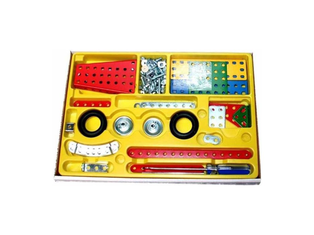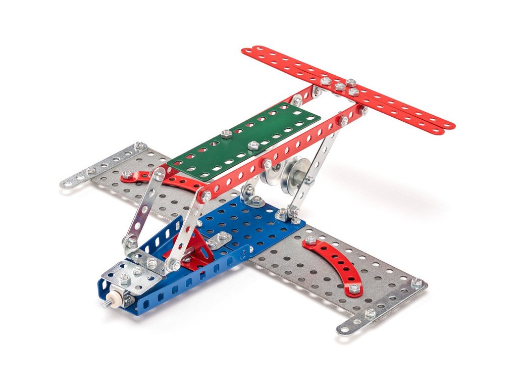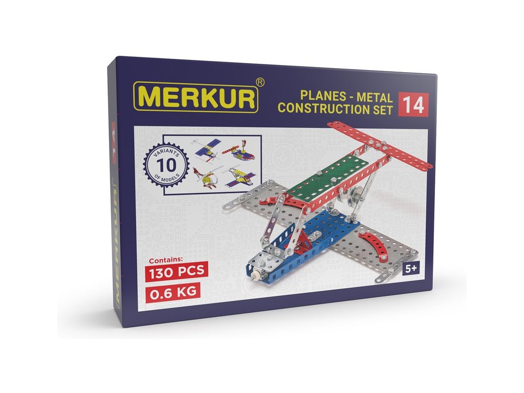 Kvalitní kovová konstrukční stavebnice Merkur letadlo 14 obsahuje 130 dílků pro stavbu až 10 modelů dle návodu a mnoho dalších, které si vymyslíte. Vhodné pro děti od 5 let