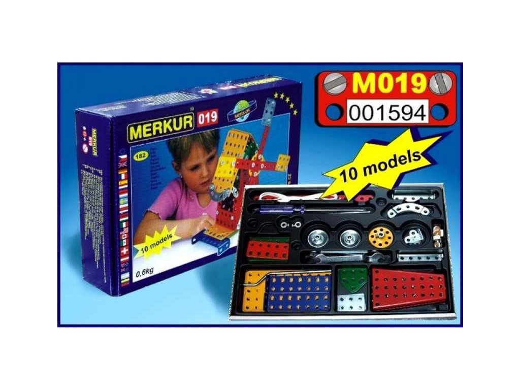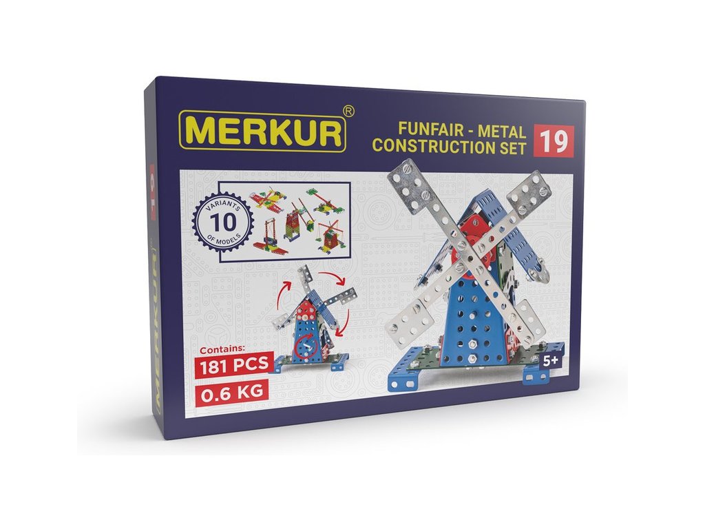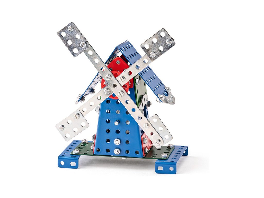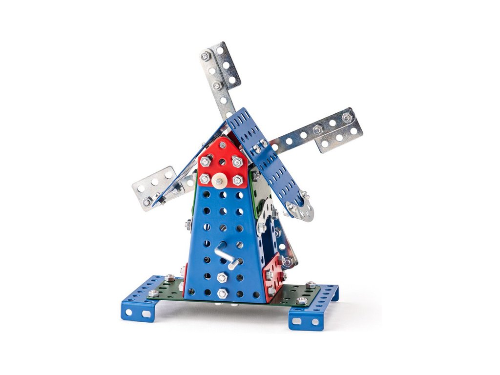Kvalitní česká kovová konstrukční stavebnice Merkur větrný mlýn 019. Obsahuje 181 dílků. Je vhodné pro děti od 5 let.