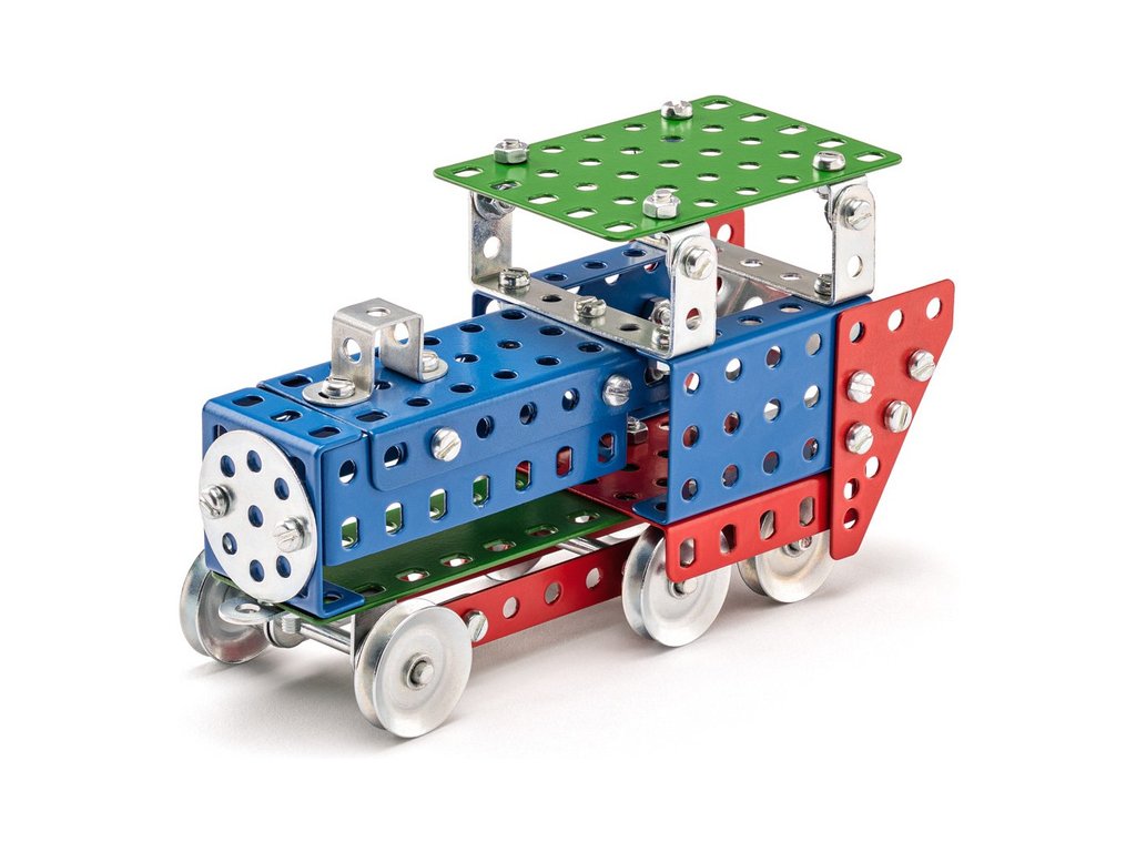 Tradiční česká kovová konstrukční stavebnice Merkur - 031 Železniční modely, ze které můžete stavět dle své fantazie nebo použít přiložený návod na stavbu lokomotivy, či vagónu. Stavebnice obsahuje 220 dílků. Vhodné pro děti od 5 let.