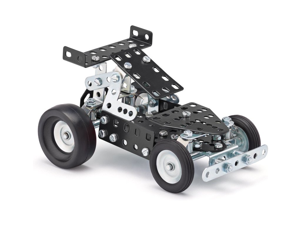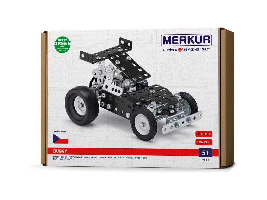 Stavebnice Merkur terénního autíčka Buggy, vhodná pro začínající konstruktéry a stavitele. Ze stavebnice je možné podle návodu sestavit 10 různých modelů. S vytvořenými modely si můžete i hrát a nejen stavět. Stavebnice obsahuje 126 dílků.