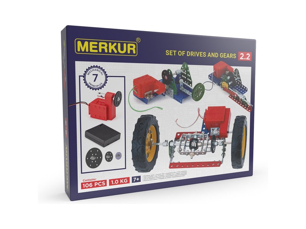 Česká kovová stavebnice MERKUR Velká sada - Pohony a převody - je ideálním doplňkem ke všem větším stavebnicím, které rozpohybuje. Počet dílků 106. Vhodné pro děti od 7 let