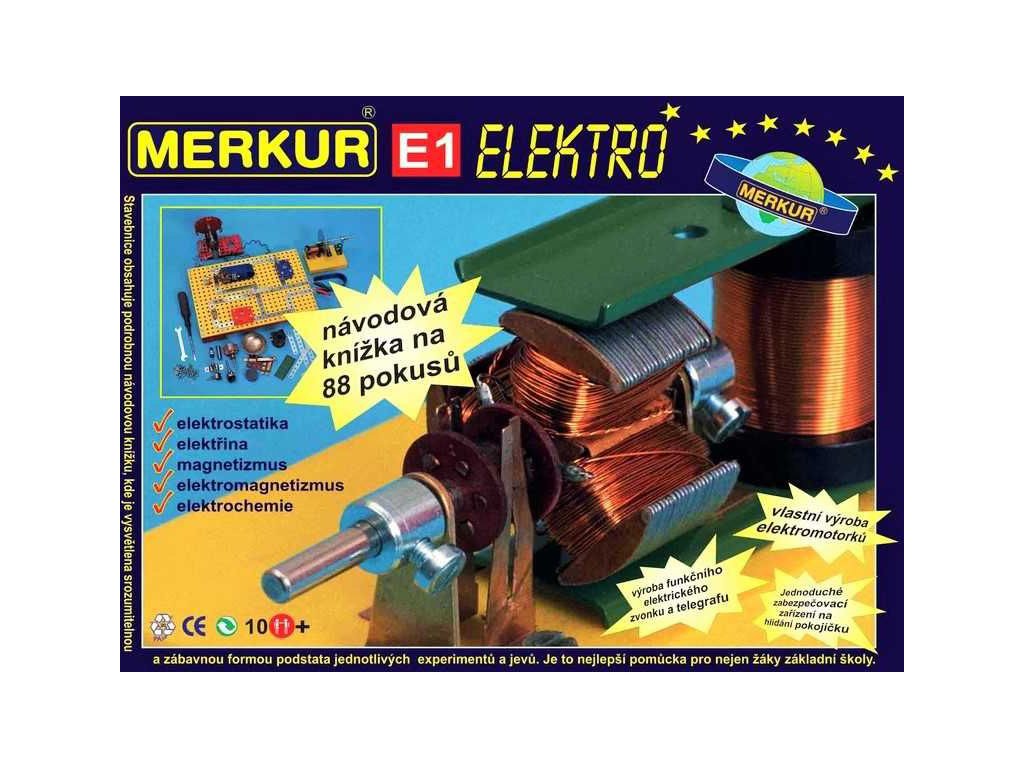 Stavebnice generací – MERKUR kovová stavebnice českého výrobce. Merkur elektronik E1, vhodná pro děti od 10 let, je stavebnice ideální pomůckou pro žáky ZŠ, kteří se ve škole poprvé v hodinách fyziky seznamují se základy magnetizmu a také s tím, jak vzniká elektrický proud. 88 pokusů v návodu.
