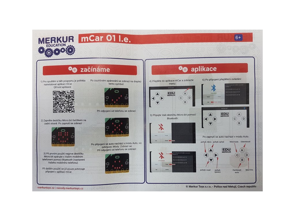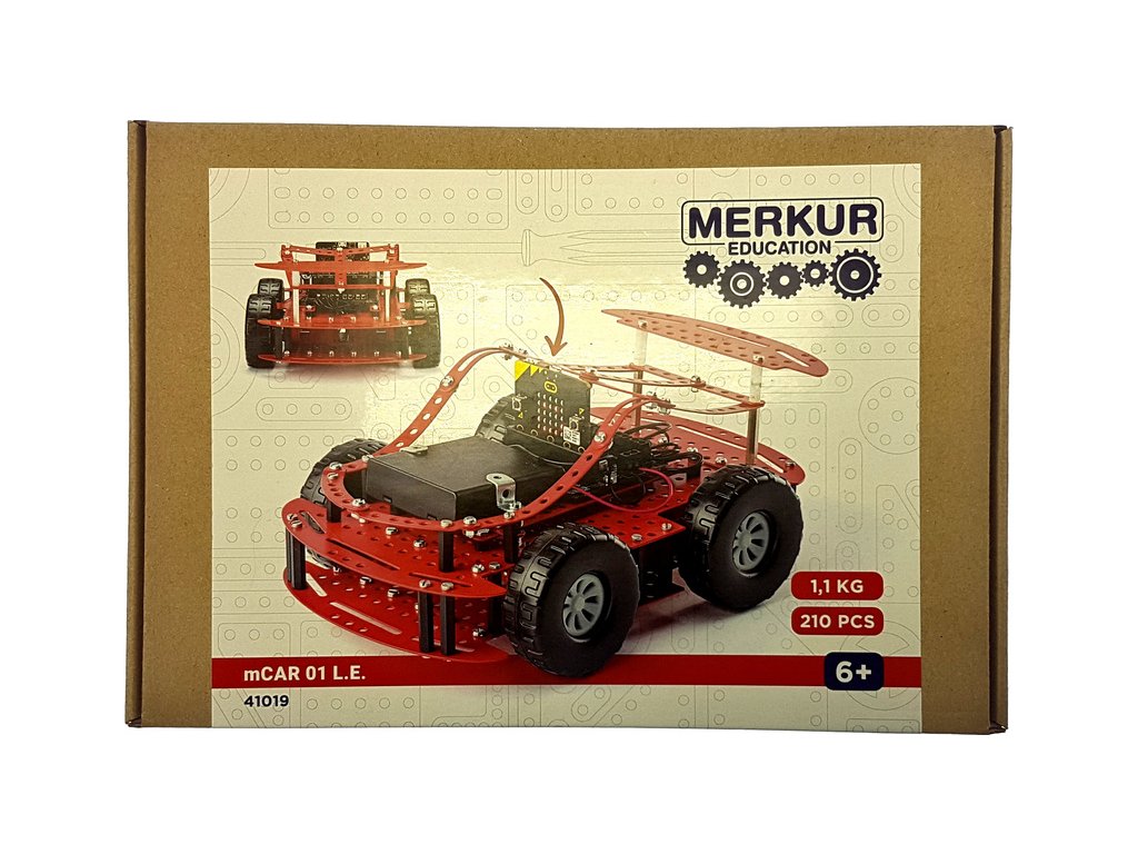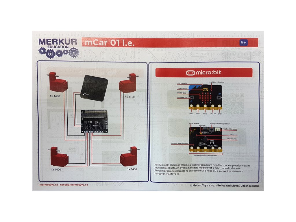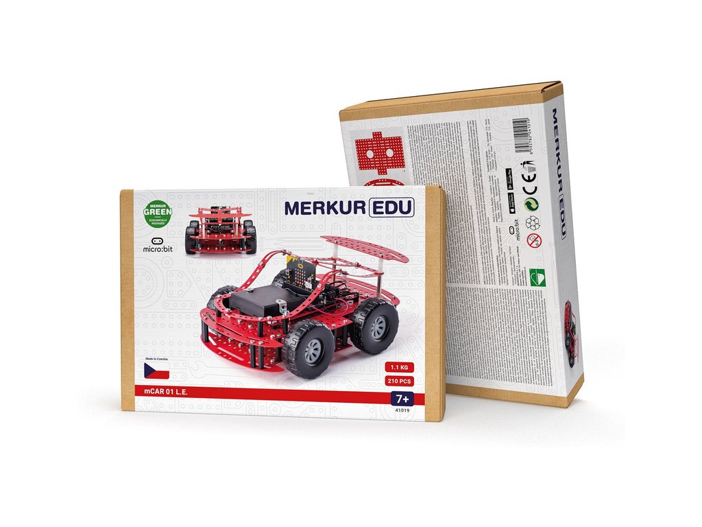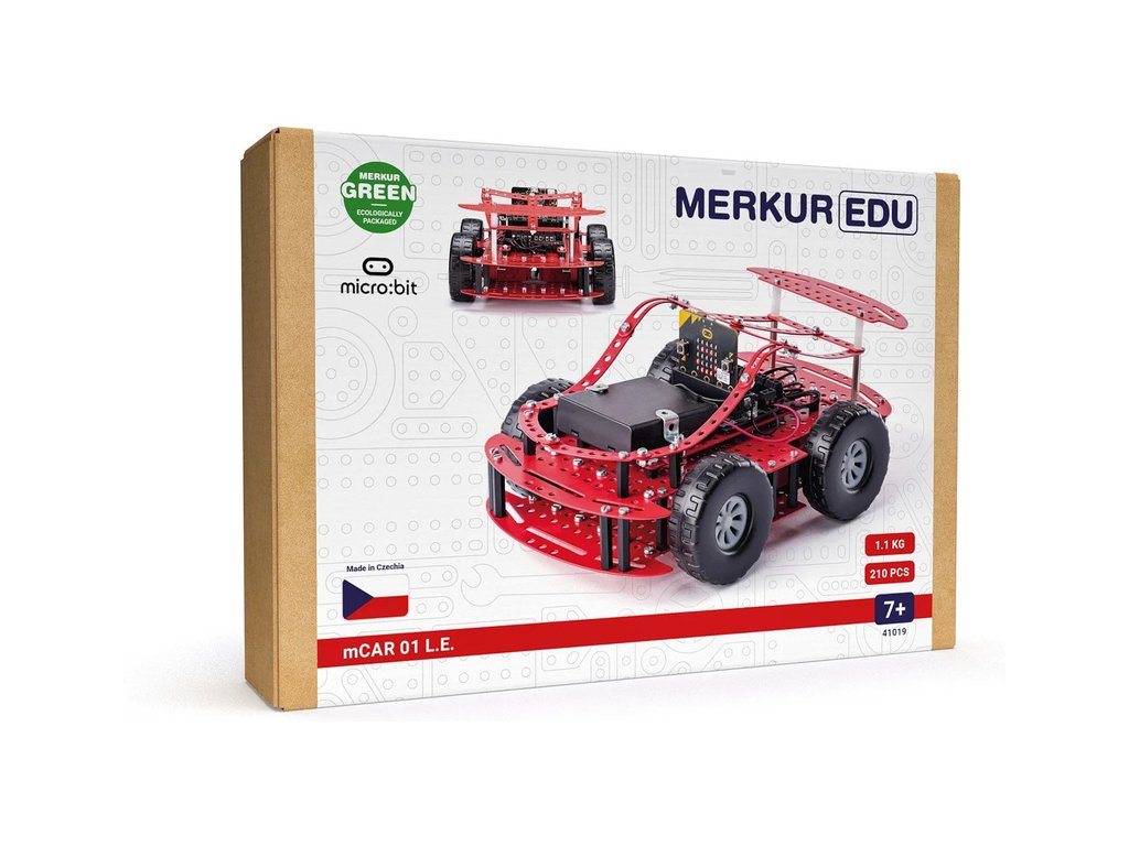 Klasická česká stavebnice Merkur - výuková stavebnice auta mCar 01 l.e s programovatelnou platformou Micro:Bit. Ovládání autíčka, respektive jednotky Micro:Bit je možné pomocí aplikace mCar v telefonu (připojení přes bezdrátové rozhraní Bluetooth). Programovaní jednotky pro další funkce je možné přes výukový program Make Code pro MicroBit. V programu je možné výukové programování přes grafické blokové rozhraní nebo přes jazyky Javascript a Python.