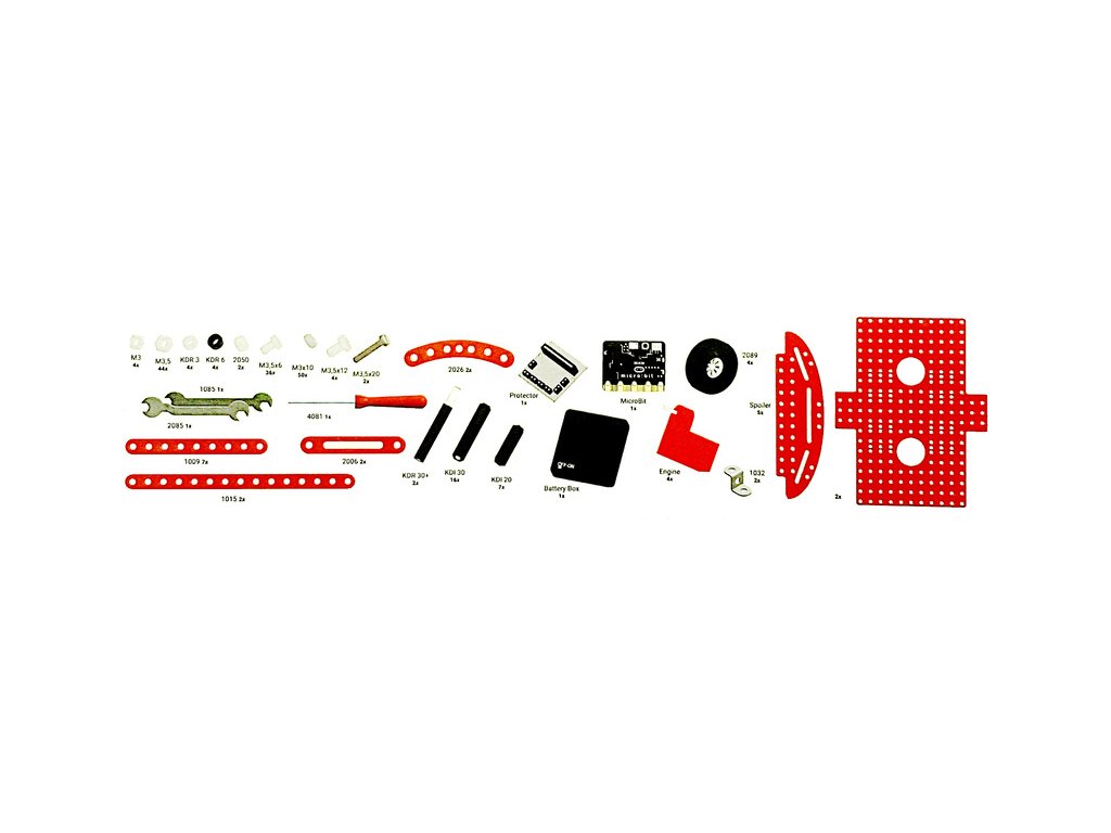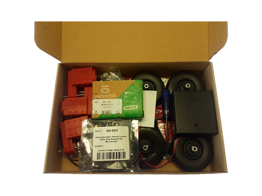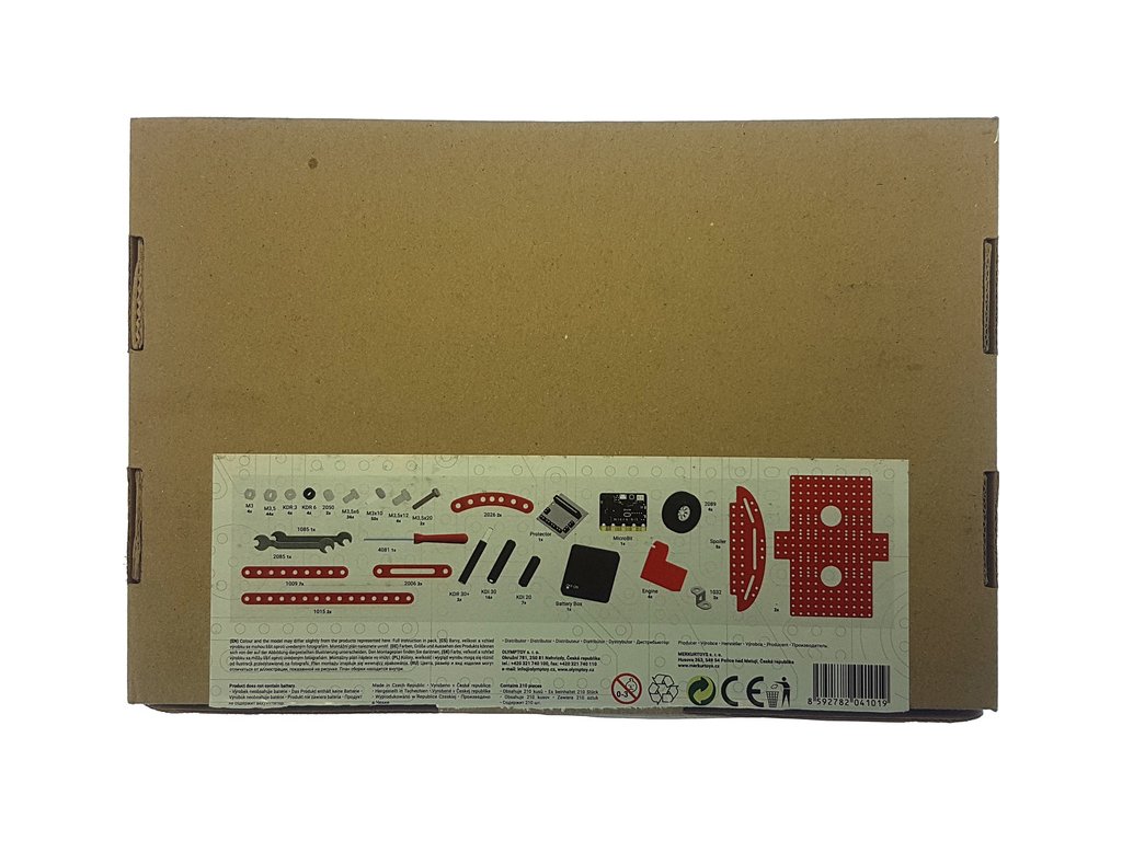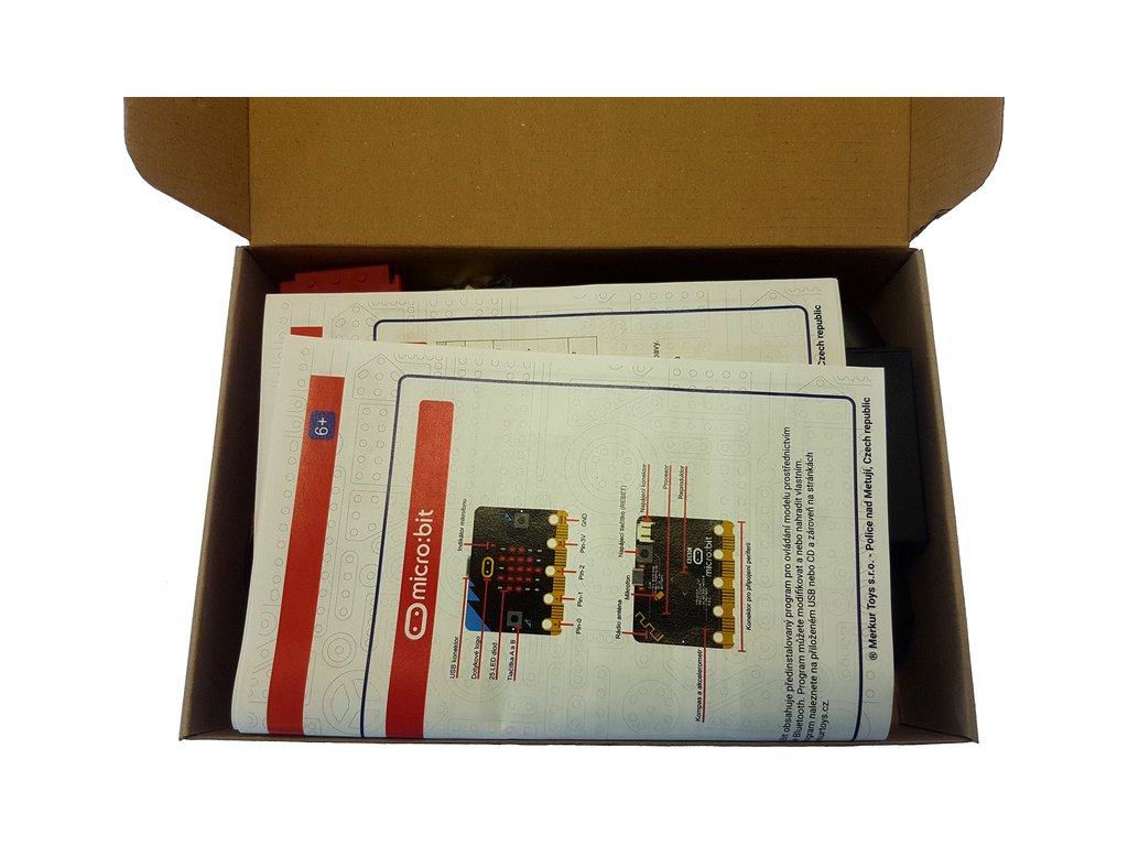 Balení obsahuje: řídící jednotku Micro:Bit, jednotku řízení motorů Kitronik 5698, box pro baterie, USB Flash disk, 4x motor a díly Merkur.
