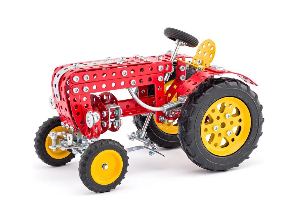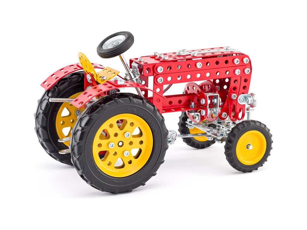 Klasická česká stavebnice Merkur - Retrotraktor. Pohyblivý volant je spojen s přední osou a umožňuje zatáčení. Merkur díly jsou univerzální a tak vás neomezí v jakékoli modifikaci a nápadu. Stavebnici tak můžete sestavit podle návodu nebo podle svých představ.
