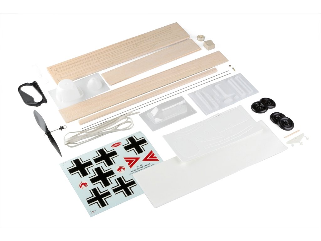 Stavebnice obsahuje: balsové předseknuté díly, balsové nosníky, vakuově lisované maketové díly (kryt motoru...), plastovou vrtuli s hřídelí a hlavicí, gumový svazek (guma 5x1mm), plastová kola, ocelovou strunu na podvozek a další drobné díly, plastová kola, potahový papír, aršík mokrých obtisků, stavební plán.