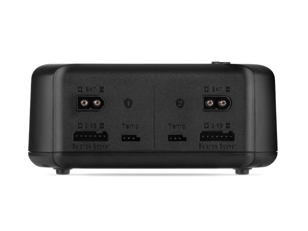 Nabíječ je v obou kanálech vybaven výstupními zásuvkami XT60 a univerzálními zásuvkami pro servisní konektory JST-XH umožňující přímo zapojit silové kabely akumulátoru a servisní konektory JST-XH sad 2–6S – pokud používáte sady s konektory XT60 a JST-XH, obejdete se zcela bez nabíjecích kabelů a adaptérů. Pro připojení servisních konektorů jiných systémů můžete použít standardní adaptéry Sky RC nebo RC System.