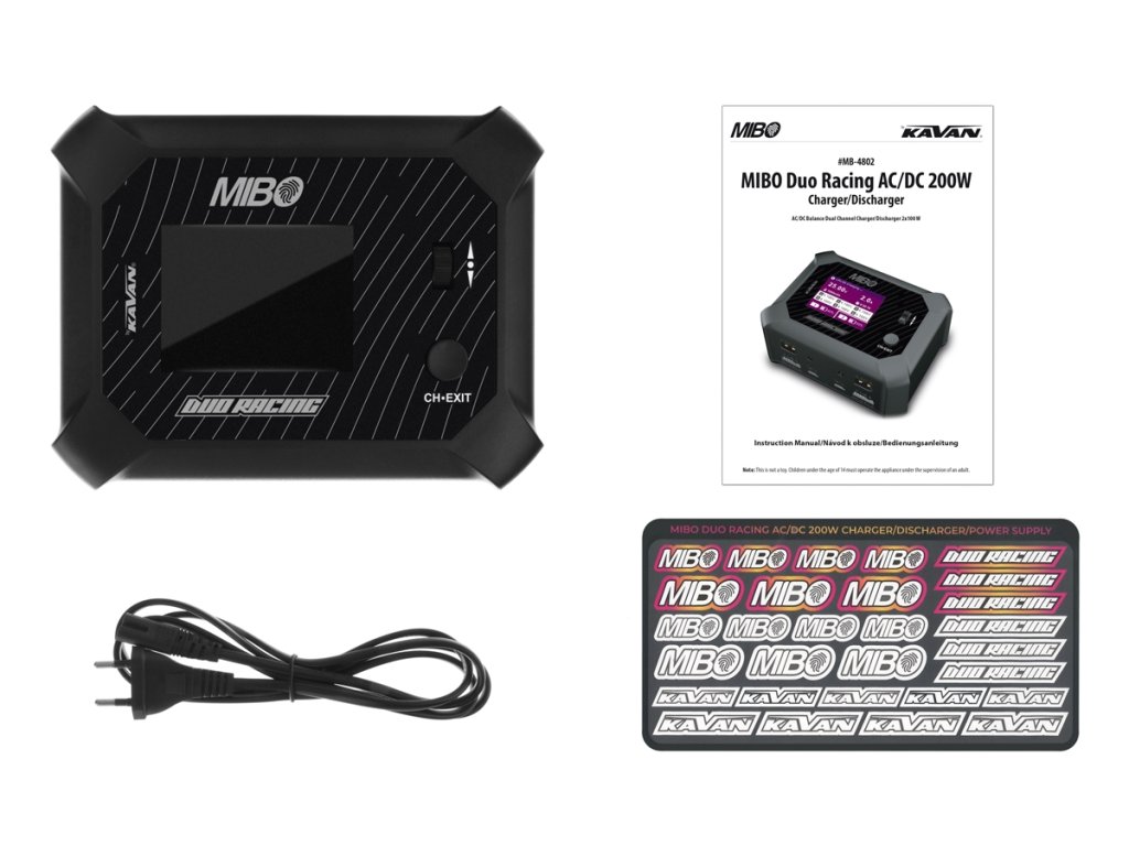 Sada nabíječe obsahuje: nabíječ MIBO Duo Racing AC/DC 200W Charger/Discharger, návod.