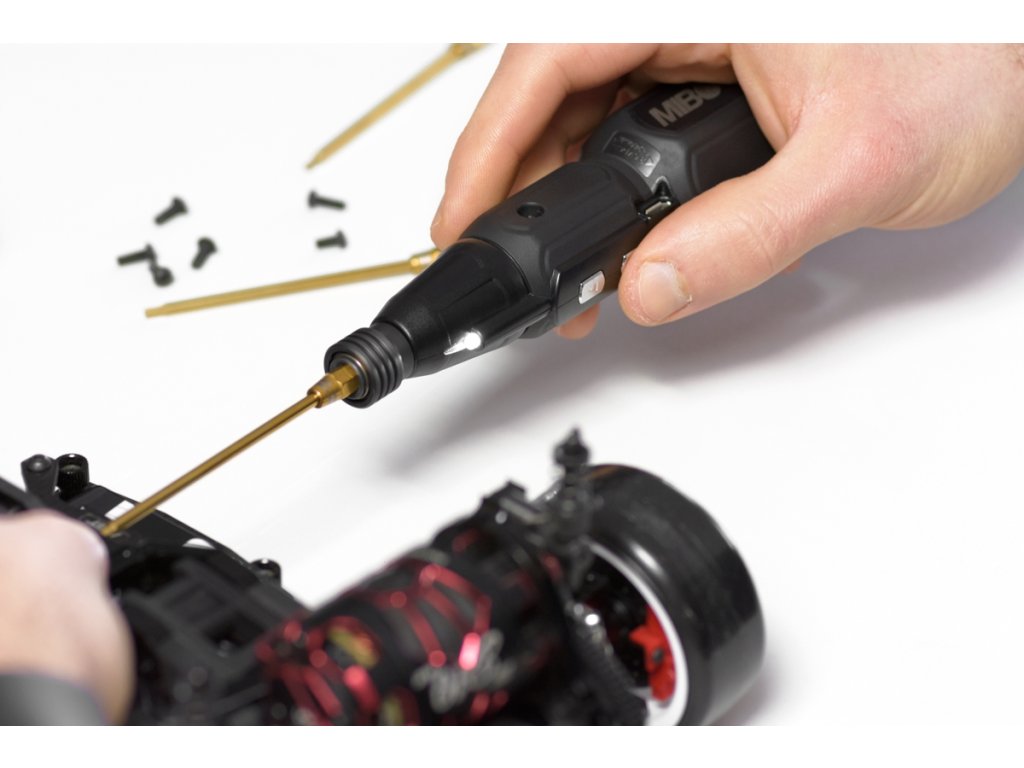 MIBO Elektrický šroubovák je neocenitelný pomocník, díky kterému je skládání a rozkládání RC aut a jejich komponent snadné a rychlé. Jeho překvapivě kompaktní rozměry a nízká hmotnost, v kombinaci s protiskluzovou pogumovanou rukojetí, ho činí velmi pohodlně ovladatelným.