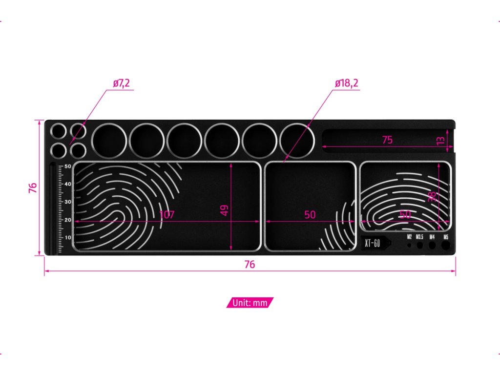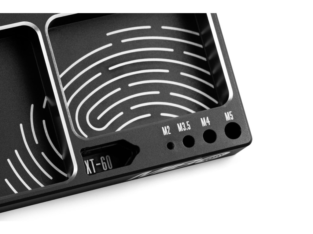 Tento stojánek také obsahuje integrovanou měrku pro rychlé měření délky šroubků, což je nezanedbatelné pro správnou montáž a nastavení vašich modelů. A pro všechny, kteří se věnují práci s bateriemi, či elektrickými zařízeními, naleznete zde praktické otvory pro pájení konektorů typu XT60 a 2, 3,5, 4 a 5mm bullet, což zjednoduší proces pájení.