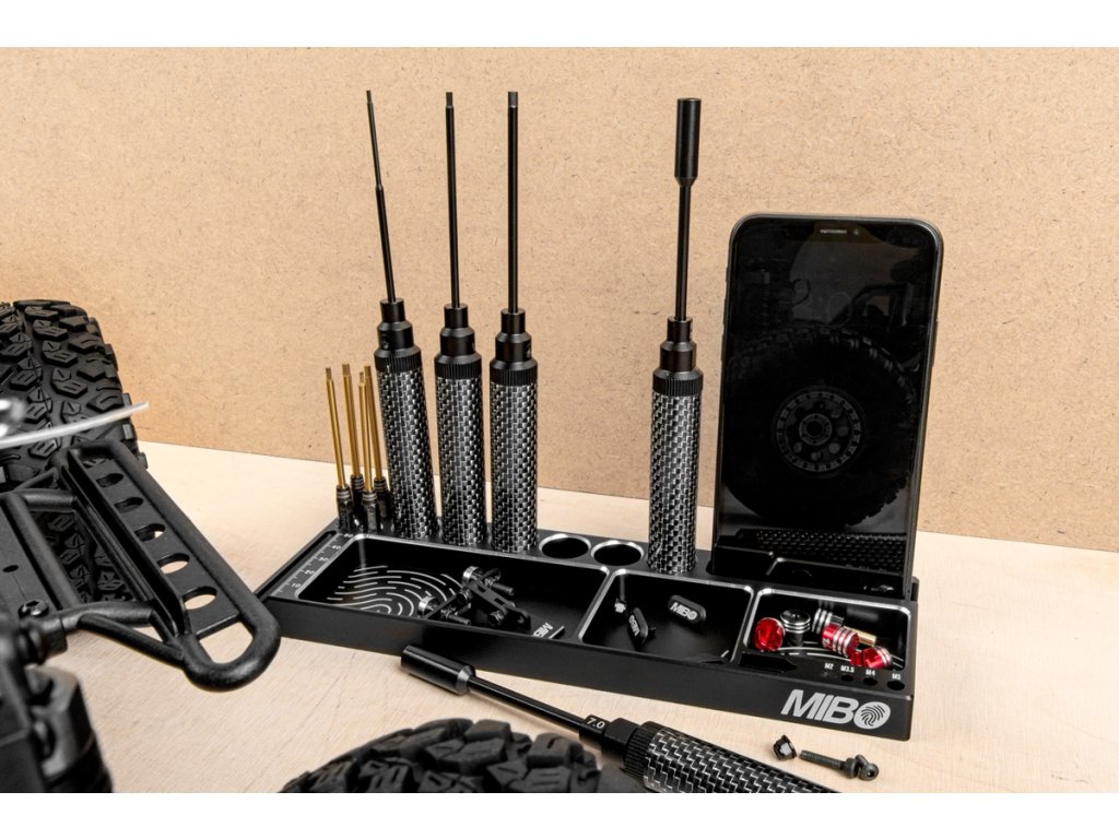 MIBO hliníkový stojánek poskytuje prostor pro 6 ks šroubováků, 4 ks bitů elektrického šroubováku, mobilní telefon a přihrádky pro uspořádání a ukládání drobných dílů a šroubků. Navíc obsahuje i integrovanou měrku pro rychlé měření délky šroubků a praktické otvory pro pájení konektorů typu XT60 a 2, 3,5, 4 a 5mm bullet. Díky tomu budete mít vše, co potřebujete, na jednom praktickém místě. Vaše práce s RC modely, elektronikou a jinými projekty tak bude organizovanější, rychlejší a efektivnější.
